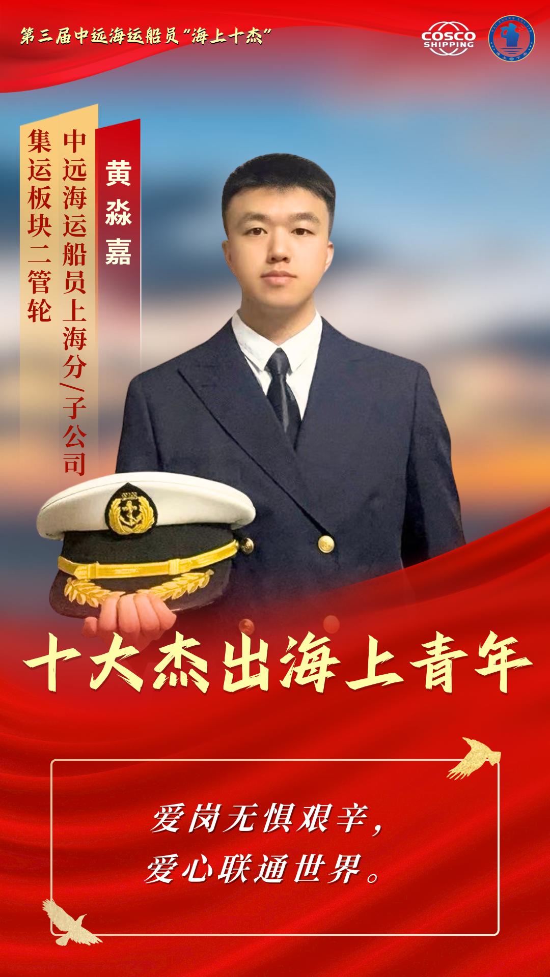 作为中远海运船员上海分公司集运板块二管轮,黄淼嘉始终秉持爱岗敬业、乐于奉献的初心,在每项任务中都兢兢业业、全力以赴。在船期间,他不惧脏累,多次带头清理重油舱、污水井、锅炉烟道,以辛勤汗水筑牢设备正常运行与船舶准点班期的坚实根基。他不仅深耕岗位,更心系行业与社会,多次协助公司赴航海院校开展招生宣传,耐心为有志学子答疑解惑,为航运事业注入新鲜血液。同时热心公益事业,坚持参与无偿献血,每月定期向联合国儿童基金会捐款,以点滴善举传递温暖、守护童心。凭借突出表现,他先后获得公司“优秀共产党员”“青年岗位能手”、分公司“优秀共青团干部”等荣誉,用坚守与热爱书写新时代海员的青春华章。