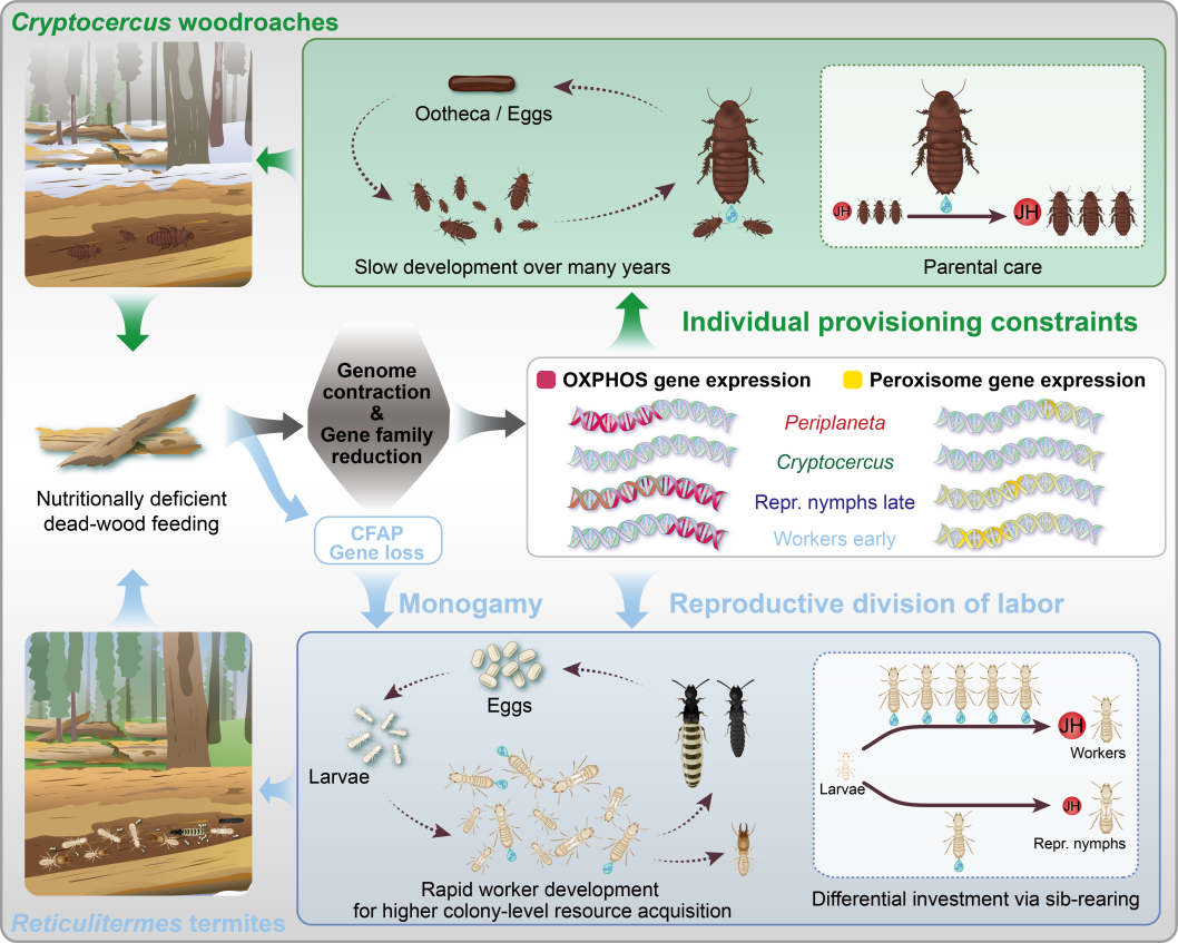 研究团队选取蟑螂-白蚁演化中关键节点的代表性物种,获得了三种蟑螂、一种半社会性木蟑螂以及四种社会性白蚁的高质量基因组,并结合关键物种不同发育时期的转录组数据,通过比较研究木蟑螂与白蚁,揭示了社会性演化的驱动因素,绘制了从杂食性独居蟑螂到具有不同社会性程度的白蚁的基因演化图谱,为深入理解昆虫适应性性状的创新提供了重要见解。