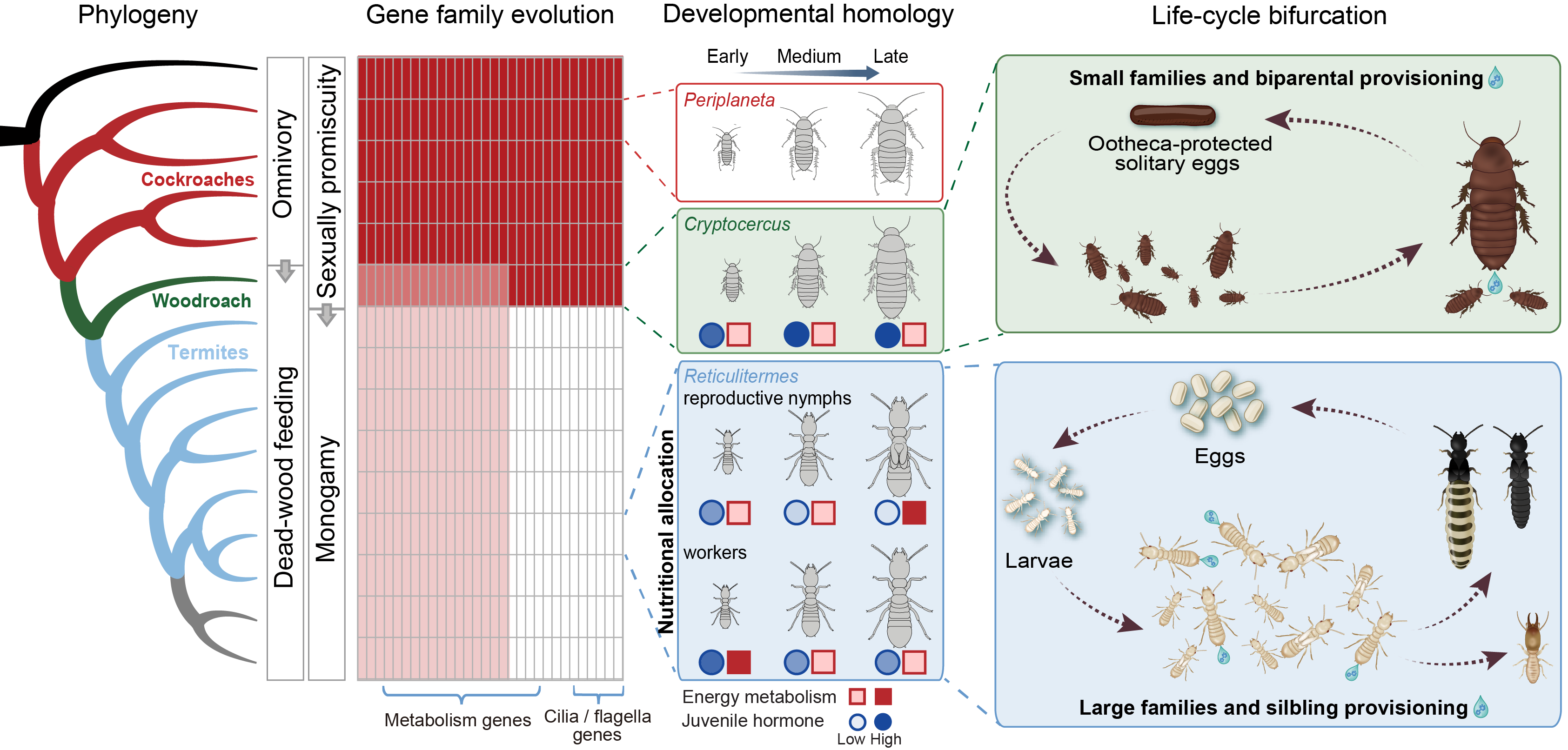 昆虫社会性表现为亲代抚育和品级分化,即通过同胞间的利他行为延伸为生殖分工。这种适应性创新导致了完全变态类群——膜翅目昆虫(蚂蚁、蜜蜂和寄生蜂等)的适应性辐射,并得到大量的学术关注。然而,社会性行为虽然也在蜚蠊目中独立起源(白蚁等),且起源更早,但相关研究却被长期忽视。重要的是,社会性起源在蜚蠊目中与杂食性到木食性的转变同时发生,为研究社会性起源提供了独特的模型。