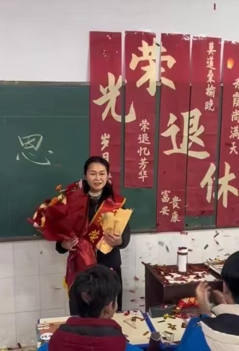 据李老师发布的视频,教室墙面悬挂着“光荣退休”的条幅,还有“莫道桑榆晚,为霞尚满天”等字样。学生们手持礼炮在教室内等候,衡老师推门进入的瞬间,学生们立即打开礼炮,礼花飞舞,老师面露惊喜。一名学生上前为衡老师披上“光荣退休”绶带,并为她佩戴大红花,两名学生送上两束鲜花。随后,一名学生代表表达对老师的感谢:“师恩难忘,愿蜡烛之光照亮您的幸福美满之路,愿桃李层层,护您幸福安康。”视频的最后,全班同学齐声向老师告白:“老师,我们爱你。”衡老师当场哽咽,强忍泪水向同学们道谢,还深深地鞠了一躬。