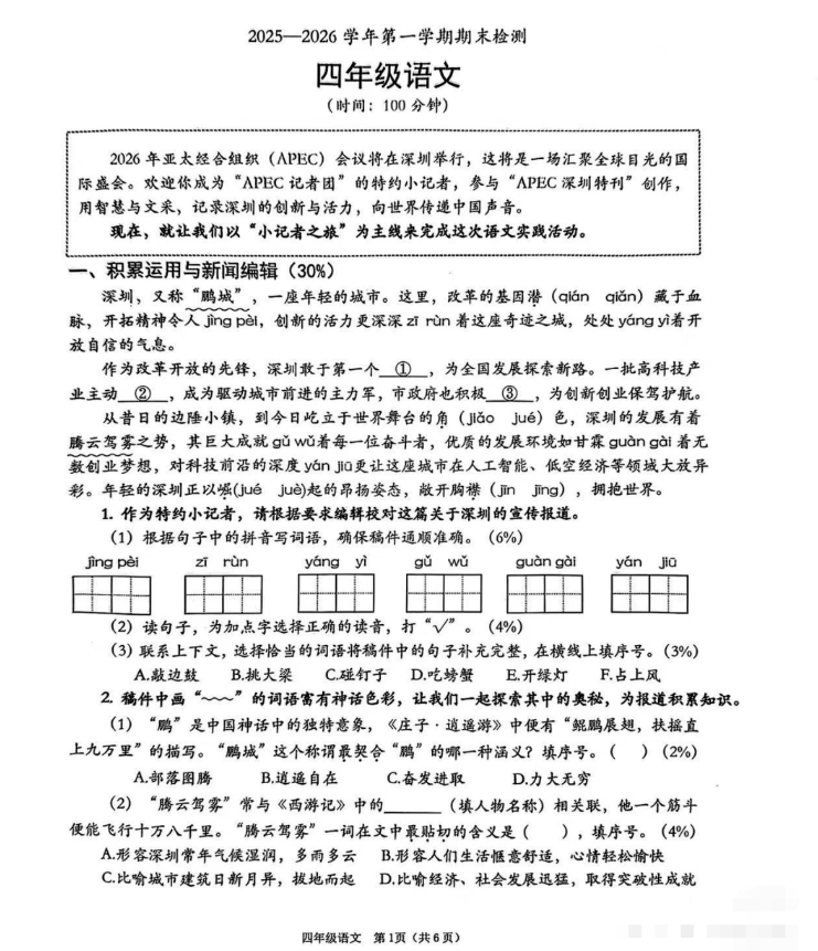 综合报道,南山区四年级语文期末卷以2026年APEC会议特约小记者之旅为主线,要求学生完成“APEC深圳特刊”语文实践创作,试卷共6页,答题时间100分钟。