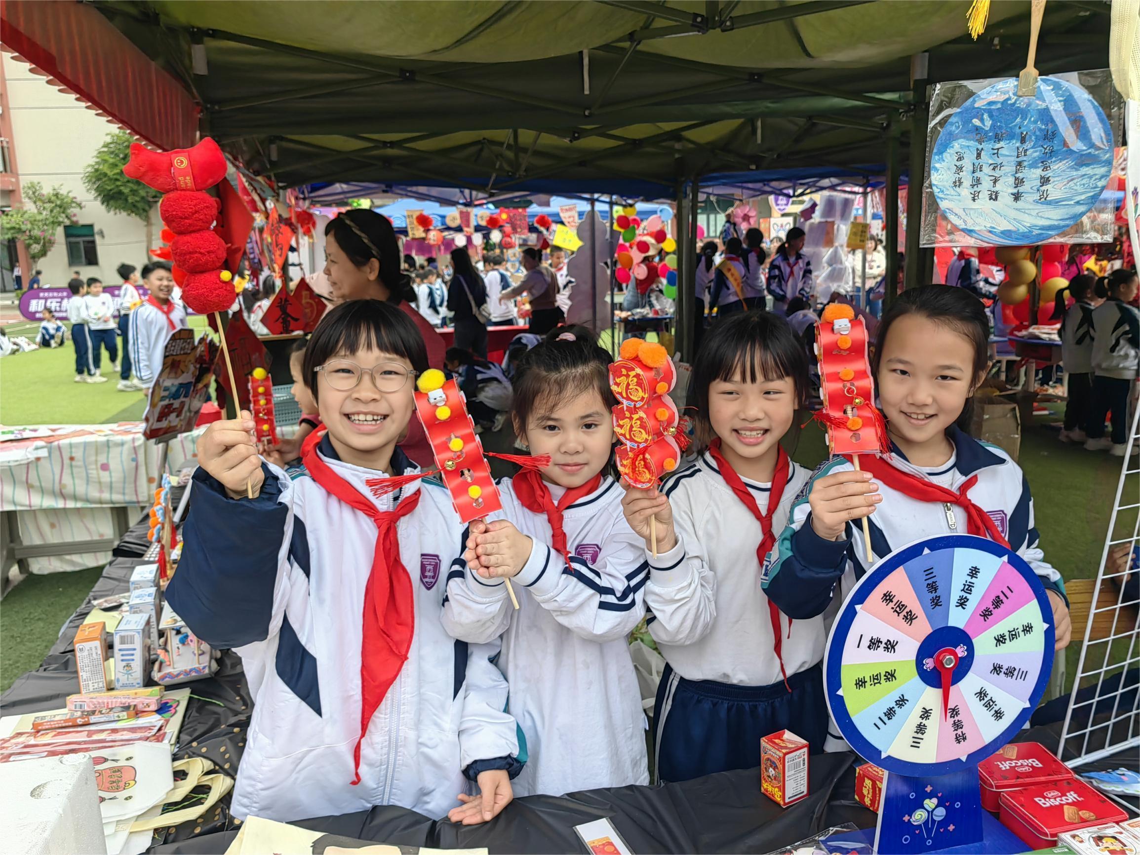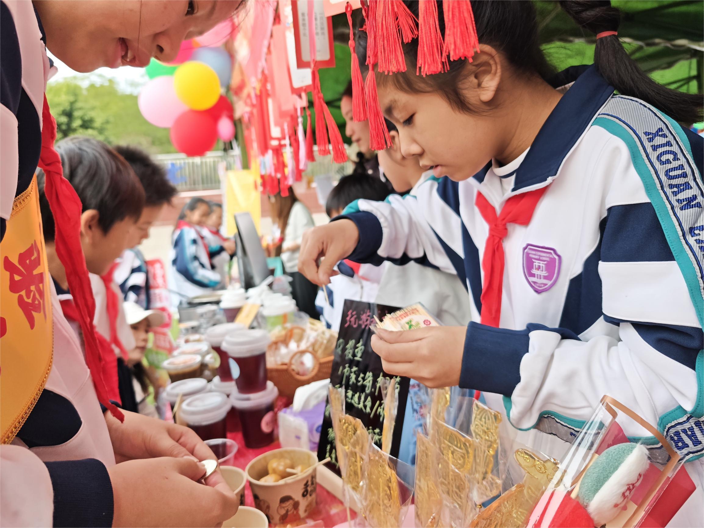 独具特色的“智美币”流通机制成为当天集市互动的一大亮点。作为唯一的流通货币,“智美币”由学生本学期在五育融合平台的日常优秀表现兑换而来,孩子们拿着积攒的“财富”,或参与非遗体验,或兑换心仪文创,或购买班级课程成果,“日常积累—实践消费—成果转化”的具象德育闭环在当天完美落地,让每一次互动都充满趣味与激励性。