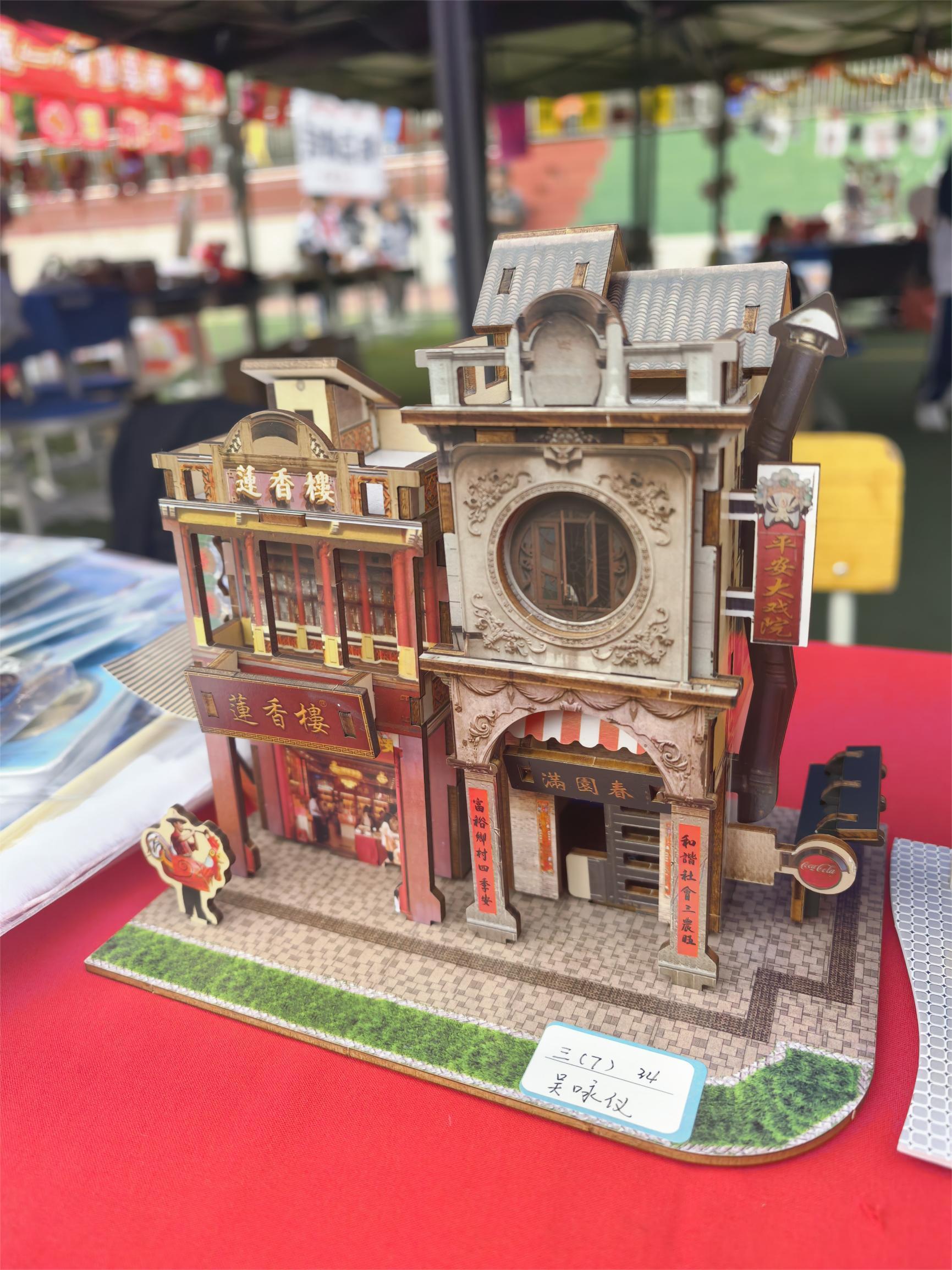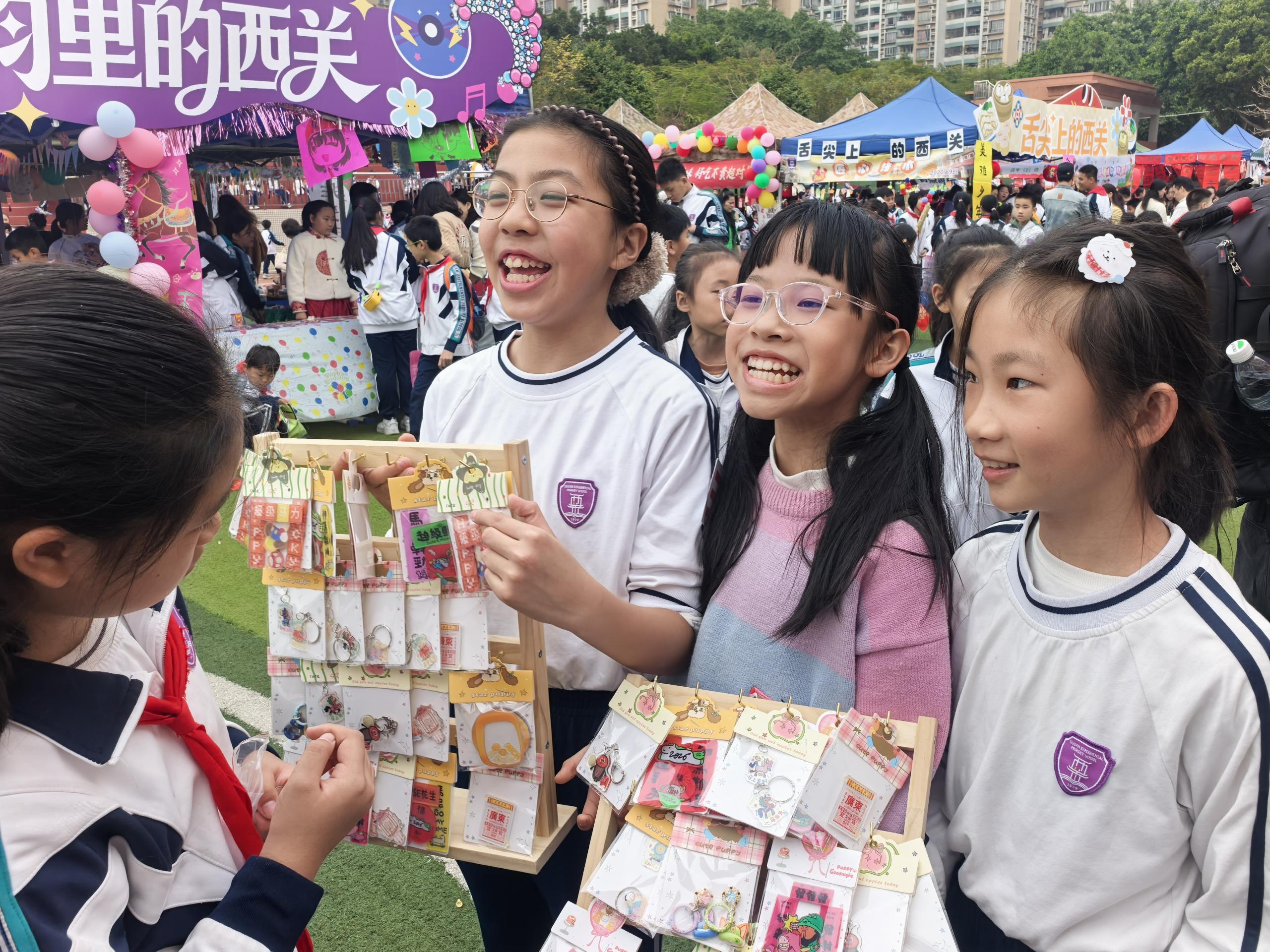 此前,各班级通过激烈的展位竞拍拿下心仪场地,这为当天的成果展示与售卖做好了充分准备,而这份自主参与的热情,也延续到了文化节当天的每一个环节。本届文化节创新设置的“舌尖上的西关”“非遗里的西关”“屋檐下的西关”“粤韵中的西关”四大特色街区,成为人气爆棚的“文化打卡地”。每一个展位都是各班级竞拍所得,同学们将本学期在西关π课程中完成的实践创作一一陈列:西关建筑手绘作品、广彩纹样文创、粤语童谣手账、传统手工艺制品等琳琅满目。作为“小小摊主”,孩子们热情地向前来参观的师生介绍作品背后的文化故事,熟练地用“智美币”完成交易;作为“文化使者”,他们主动分享自己对西关文化的理解;而在穿梭于各展位、街区的过程中,他们又化身学习者,在互动交流中汲取更多文化养分。“既是展示者、宣传者,也是学习者”的多重身份,让每个孩子都在当天的活动中收获满满,真正实现“在做中学、在体验中悟”。