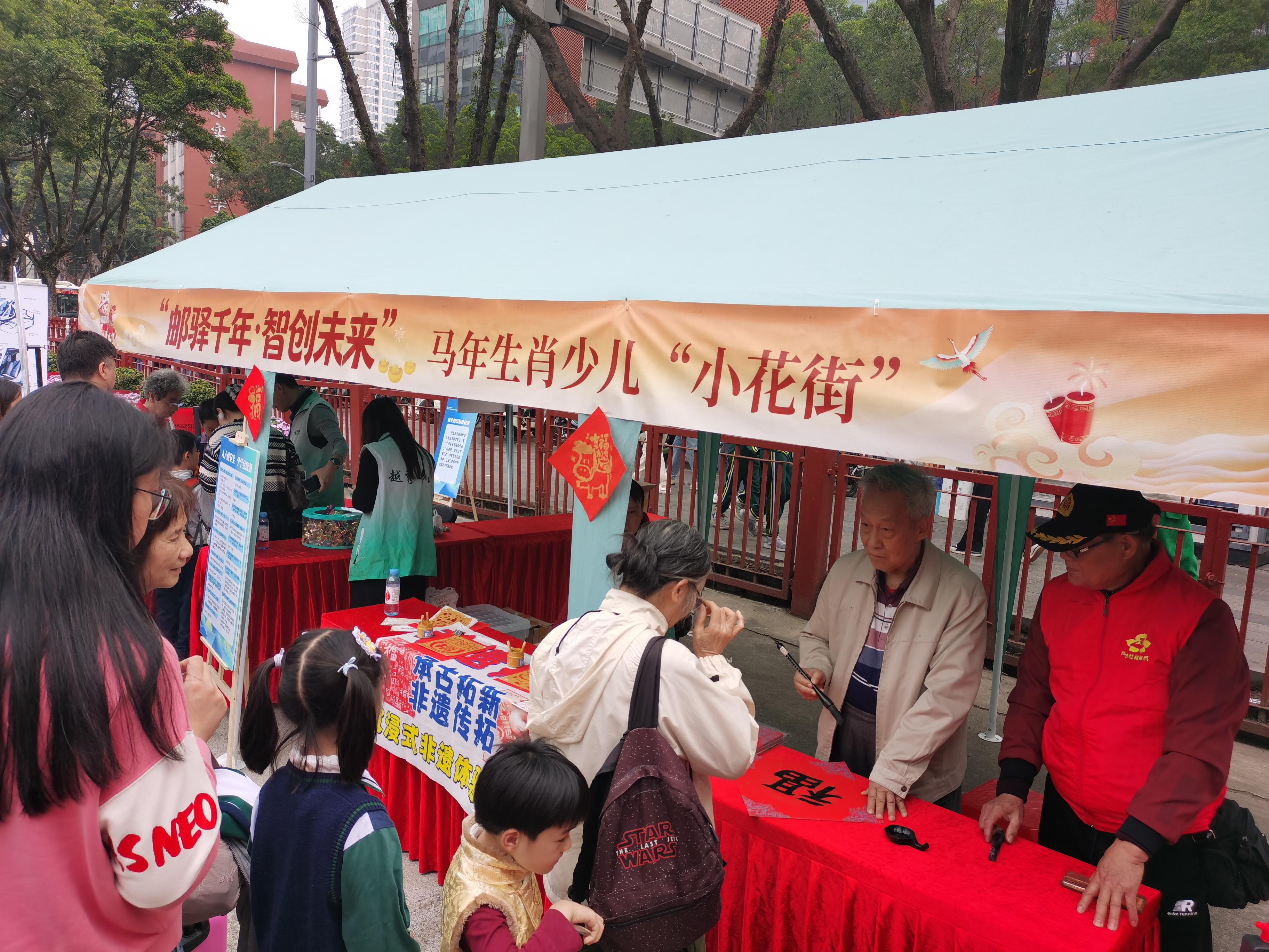 活动现场最具烟火气的非遗体验区,早已透出融融暖意。记者在活动现场看到,这里设有专属的创作台,案上笔墨纸砚齐备,大红卡纸与马年纹样底稿整齐排列,工作人员正手把手指导孩子们勾勒“马年画马”明信片——有的孩子会凝神描摹奔马矫健姿态,有的则脑洞大开,给小马添上喜庆配饰与吉祥符号;一旁的“福”字创作区更是热闹,小朋友们紧握毛笔,蘸取浓墨在红纸上落笔,或工整或稚嫩的“福”字跃然纸上,墨香与年味交织弥漫。