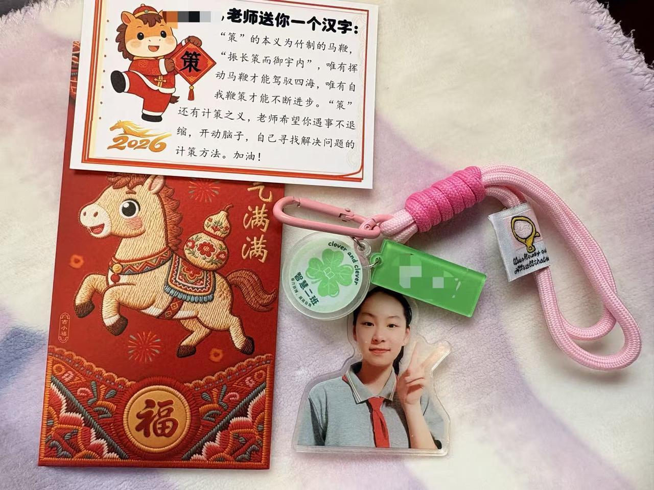 这些承载期许的汉字被精心制作成专属小卡片,藏在马年红包里,和定制钥匙扣一起,在本周五送到每个孩子手中。“比起写在素质报告单上的传统评语,这份藏在红包里的心意,更有新年的氛围感。”陈老师说。