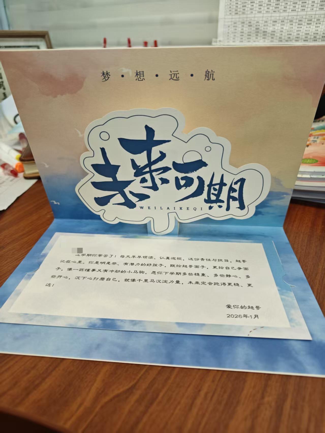 为了让这份书信更具仪式感,王老师还特意设计了专属信封,在信封上附上“未来可期”的暖心标语。“在这个快节奏的时代,大家习惯了打字、发消息,书信反而更有温度,更能传递真诚。”王老师说,他最大的心愿,是若干年后,这些孩子长大成人,还能想起,在初中时,有一位被他们叫做“超哥”的老师,认真地记录过他们的成长,真诚地祝福过他们的未来。