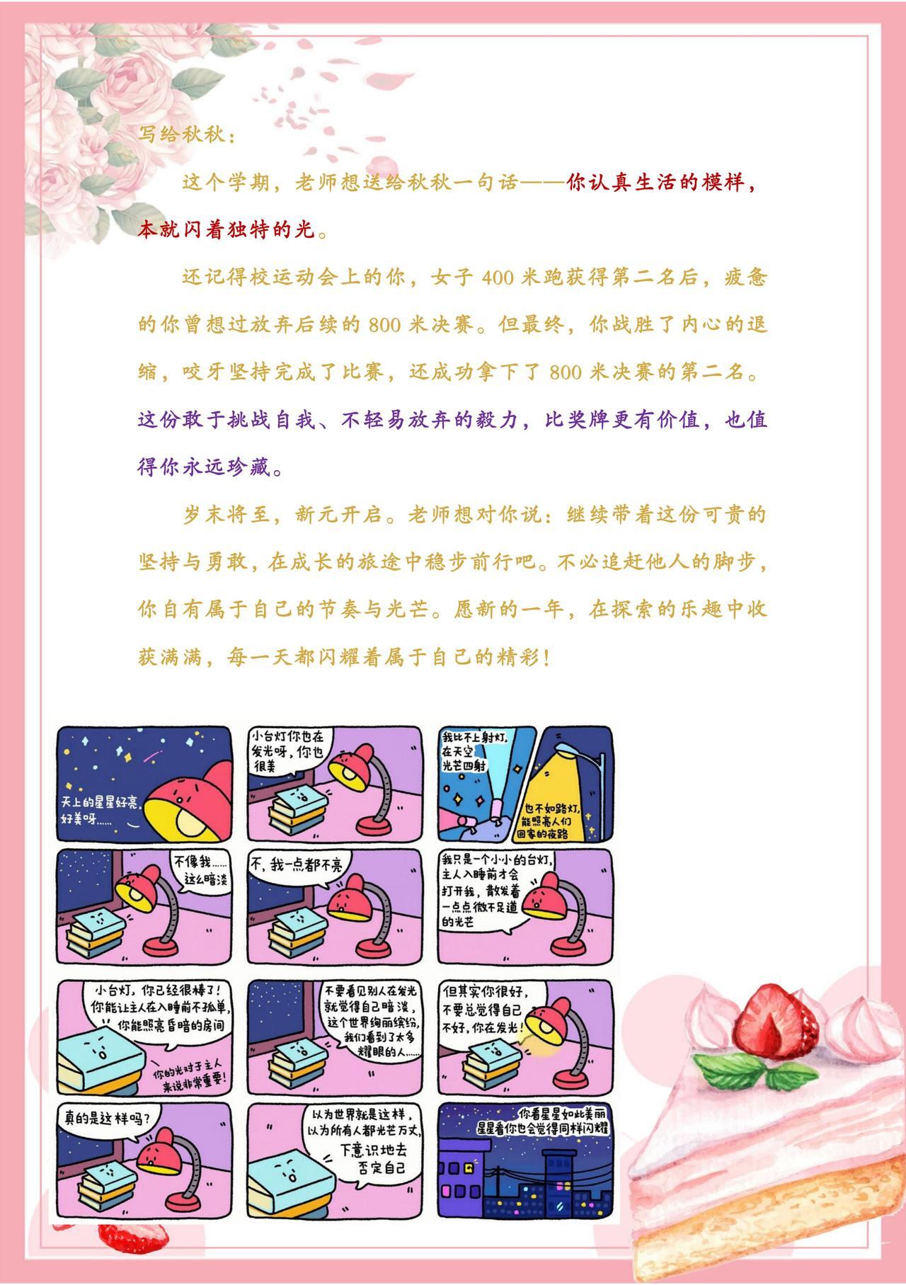 在给“秋秋”的评语中,孟老师写:“这个学期,我想送给秋秋一句话——你认真生活的模样本就闪着独特的光。”信中回顾了校运动会上,“秋秋”在女子400米获得第二名后,虽然疲惫却最终战胜内心退缩,咬牙坚持完成800米比赛并再获第二名的经历。