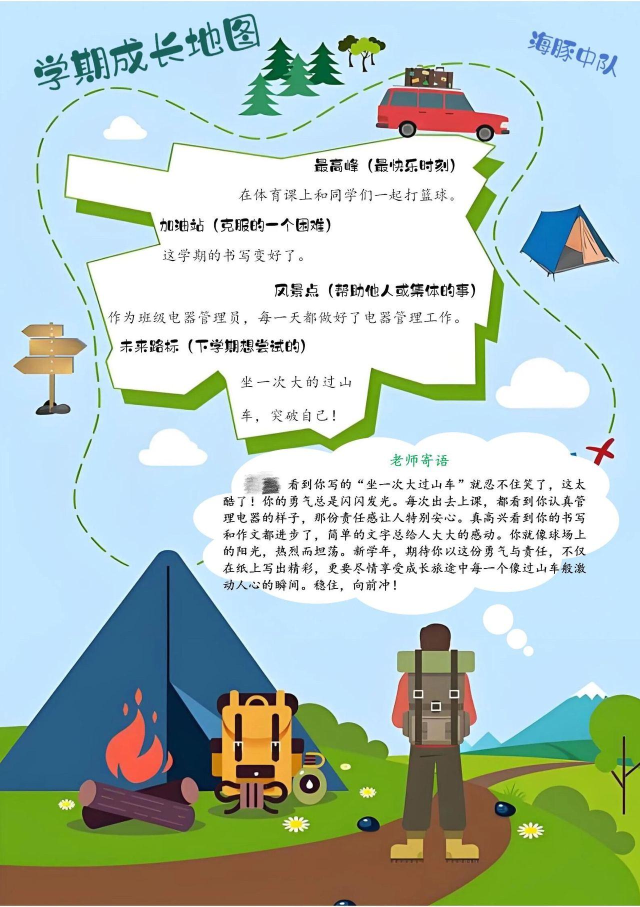 视觉语言也可以是一张导航系统的地图。钱江外国语实验学校403班班主任储赛男老师将孩子们的学期经历绘成“公路旅行图”,“最高峰”标注打破跳高纪录的时刻,“加油站”记录克服阅读恐惧的瞬间,“风景点”定格为班级布置教室的温暖画面,让成长轨迹可视化、趣味化。