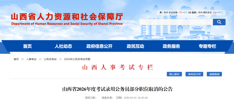 山西省2026年度考试录用公务员报名工作已经结束,部分职位因未达规定开考比例被取消(具体职位附后)。