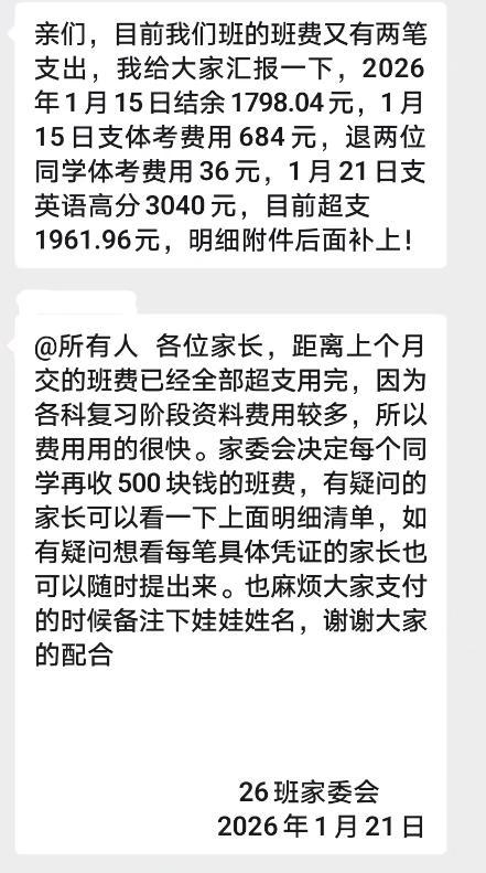 刘京提供的证据显示,负责收费的是班级家委会,最近一次收费时间是2026年1月21日,“各位家长,距离上个月交的班费已经全部超支用完,因为复习阶段各种资料费用较多,所以费用用的(得)很快,家委会决定(向)每个同学再收500块钱的班费。”
