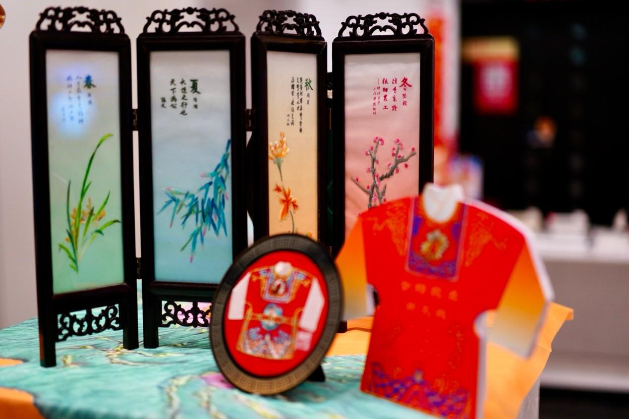 展览核心展区呈现了张雅团队与汕头颜淑仪非遗工作室的合作精品。精致的仲恺校徽LOGO摆件采用粤绣盘金绣与钉线绣技法,金线勾勒轮廓,滚针绣制文字,盘金绣呈现饱满麦穗,象征“注重实践、扶助农工”的校训精神,原木底座与精致刺绣相映成趣。与之呼应的《春夏秋冬》茶席则以丝线还原廖仲恺书法与何香凝画作,四季花卉为底,粤绣套针技法色彩如云,让观众在品茗间与先贤进行跨越时空的精神对话。