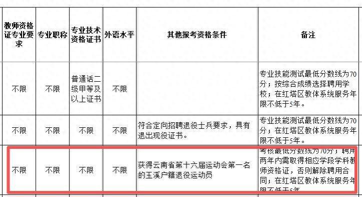 而同样是“小学体育教师(定向)”岗位,玉溪市峨山县事业单位招聘中的要求是“代表玉溪市参加云南省运动会青少年竞技运动项目比赛,获得第二名、第三名的玉溪户籍退役运动员”。