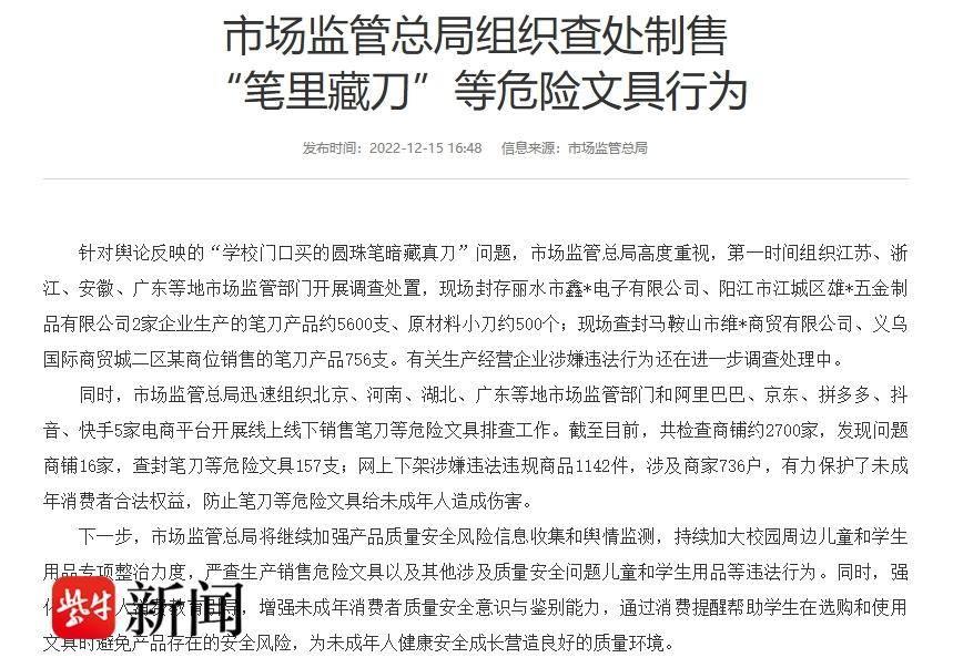 同年12月,市场监管总局就相关问题发布消息称,已第一时间组织多地市场监管部门开展调查处置,现场封存2家企业生产的笔刀产品约5600支、原材料小刀约500个;现场查封某公司、某商位销售的笔刀产品756支。同时,市场监管总局迅速组织多地市场监管部门和5家电商平台开展线上线下销售笔刀等危险文具排查工作。