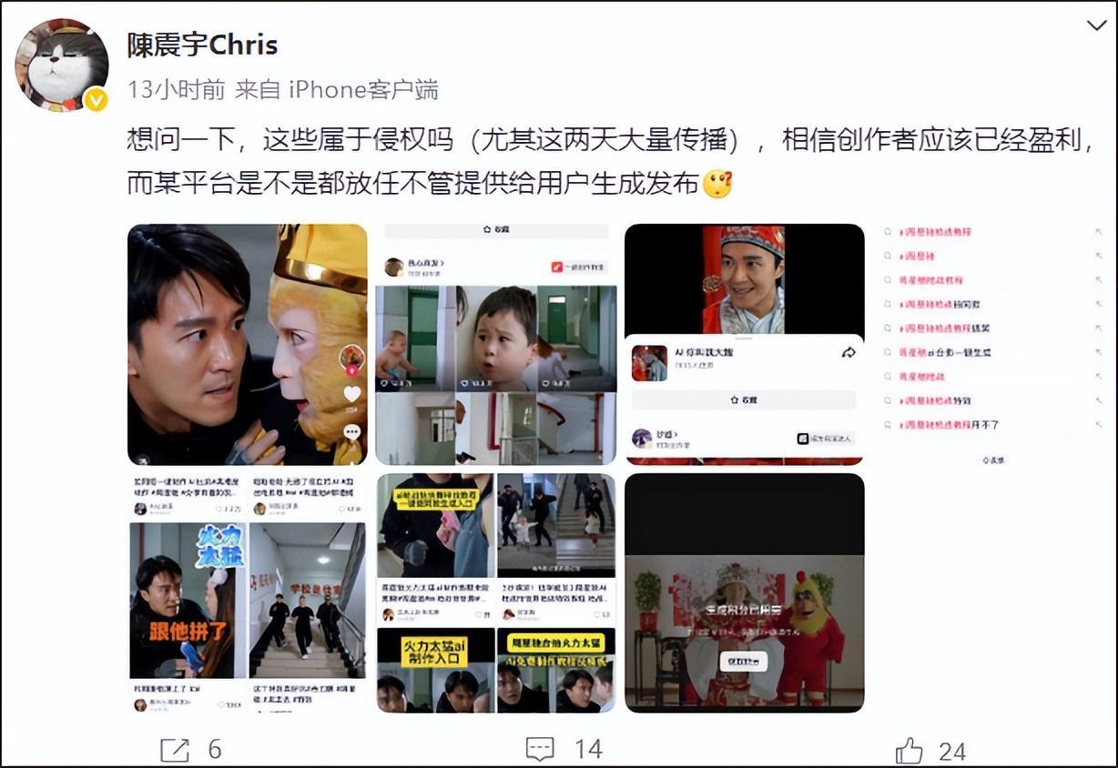 2月9日,周星驰经纪人陈震宇发文质疑:想问一下,这些属于侵权吗(尤其这两天大量传播),相信创作者应该已经盈利,而某平台是不是都放任不管提供给用户生成发布?