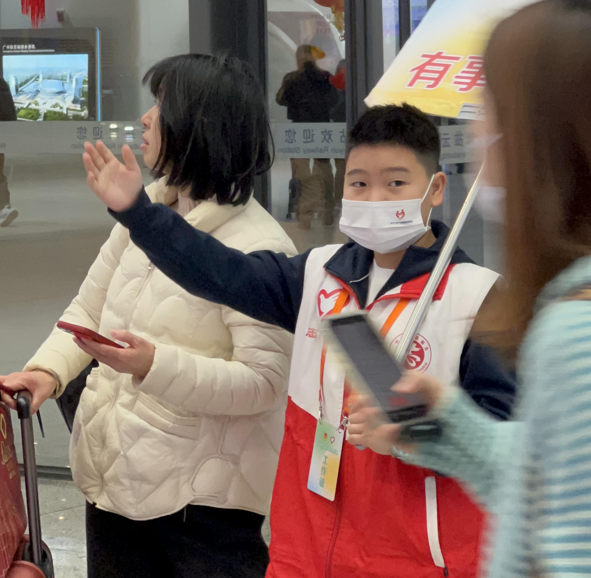 记者见到周翊轩时,他正高举“有事您吱声”的指示牌,在进站口为旅客指路。小小个头,宽大马甲,在人潮中格外醒目。他的日常工作,是为旅客提供乘车引导和车次咨询,这需要他熟记站厅布局和列车信息,还得有点“眼力见”——看到拎大件行李、对着电子屏查车次的旅客,就主动上前问一句是否需要帮忙。而对这位已经“从业”三年的小志愿者来说,这套流程已经烂熟于心。