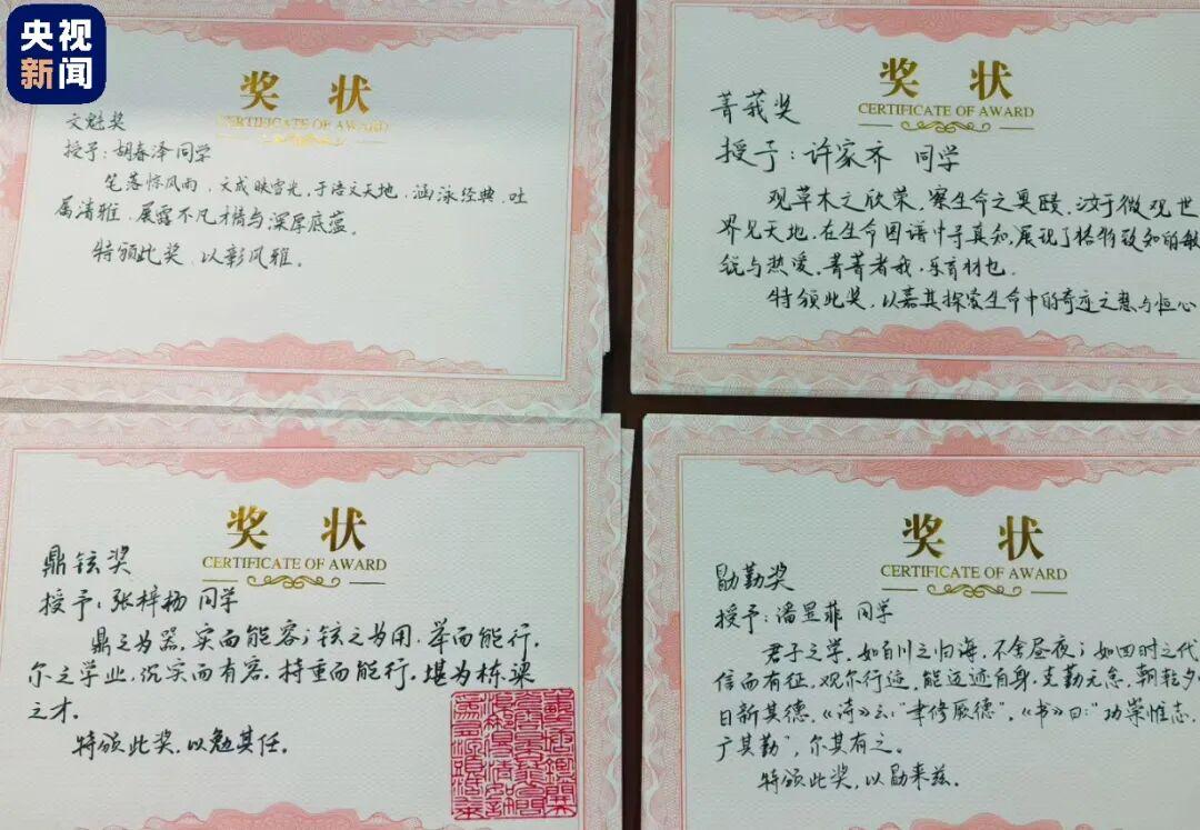 为了这次的奖状,他花了近两周时间构思,对照学生的课堂表现、日常细节,引经据典、字斟句酌。每张奖状的奖项名称、文言评语,都是为孩子量身定制的“专属”。