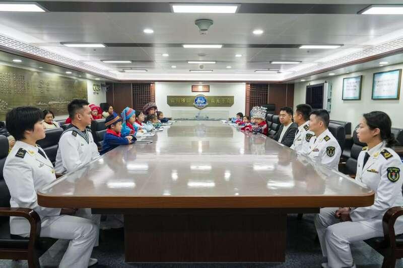 “海军的叔叔阿姨们,祝你们新年快乐,马到成功!”在交换礼物的环节,少先队员们迫不及待地向舰上的官兵们分享着他们制作的礼物。