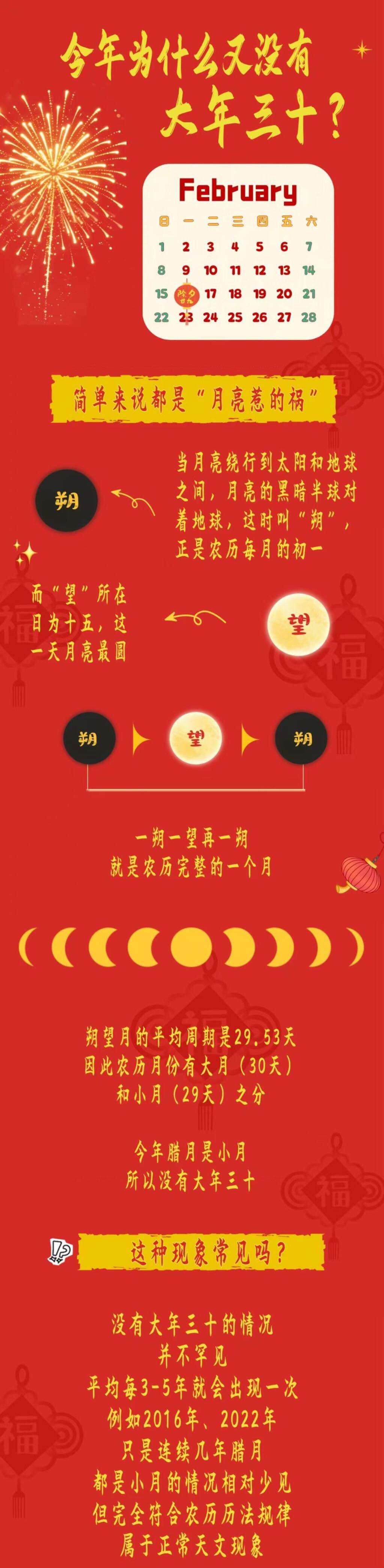 没有大年三十的情况并不罕见,平均每3~5年就会出现1次,如2016年、2022年,属于正常的天文现象。