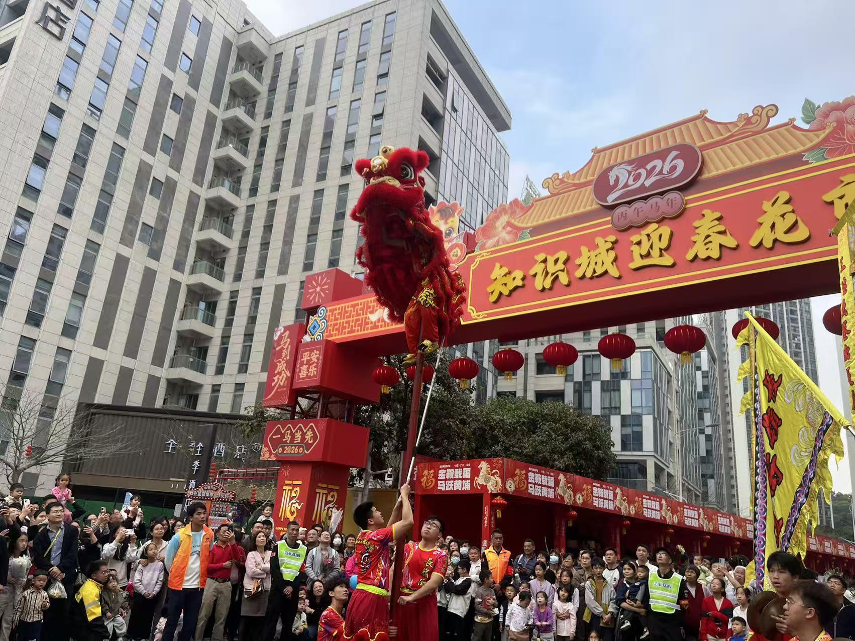 锣鼓铿锵辞旧岁,雄狮腾跃贺新春。大年初二的广州街头,处处洋溢着新春的喜庆氛围。醒狮队踏着鼓点腾跃、采青、点睛,灵动的身姿引得街坊邻里驻足喝彩,而其中一张张年轻的脸庞,更是让这项广府非遗焕发着别样的青春活力。在黄埔区长岭街道水西村,广州科学城中学高二学生李少龙和他的小伙伴们正身着狮服,为乡亲们带来精彩的醒狮表演,这是每年春节期间的例牌,成为新春里传承广府文化的一道亮丽风景线。