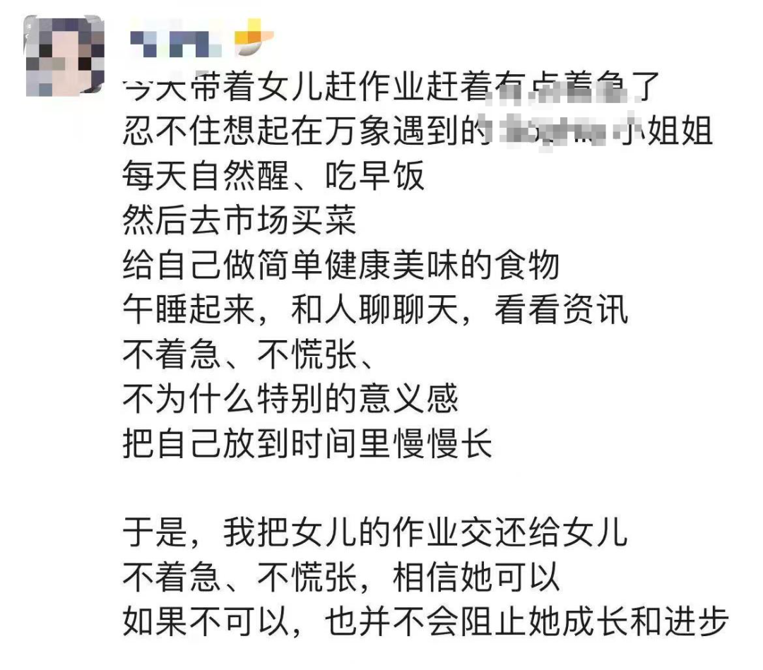 为了缓解焦虑,她和朋友聊天、和AI对话。稳住自己之后,她发了一条朋友圈:“把女儿的作业交还给女儿,不着急、不慌张,相信她可以。如果不可以,也并不会阻止她成长和进步。”
