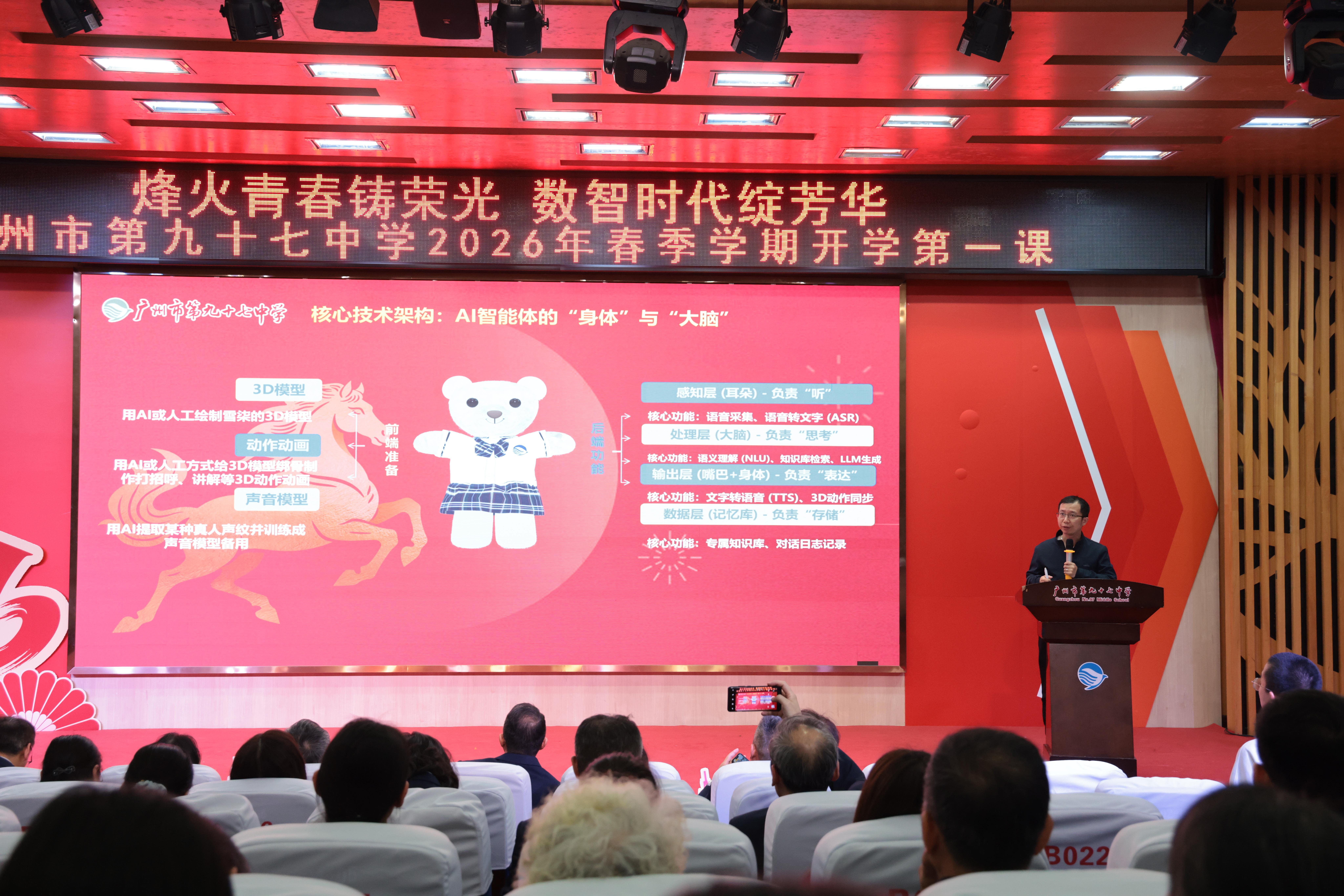 3月1日,广州市第九十七中学以一场融合红色底蕴、岭南风韵与数智创新的开学盛典,开启新学期征程。本次开学第一课以“烽火青春铸荣光 数智时代绽芳华”为主题,为全校师生呈现了一堂生动而深刻的“铸魂启智”第一课。