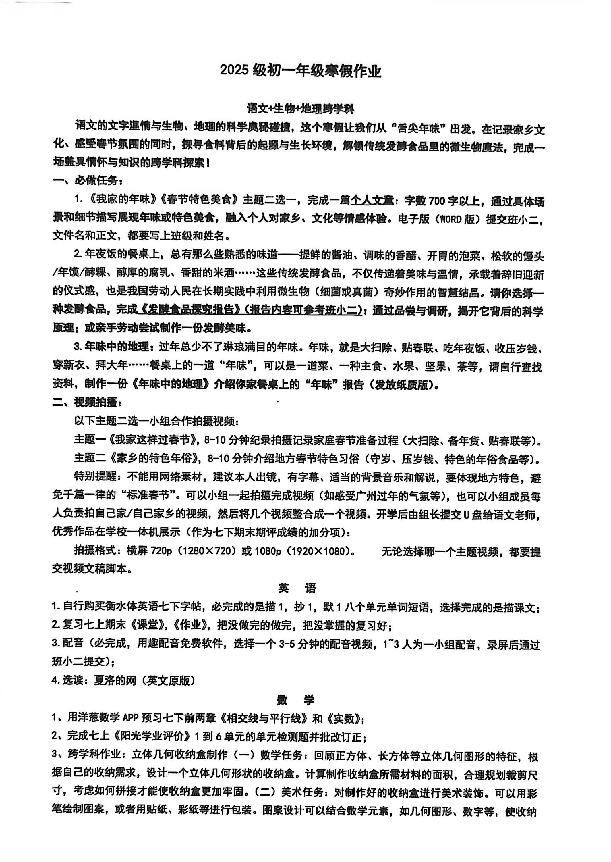 在广东实验中学语文科组的春节主题作业中,七年级的语文寒假作业还得到了生物和地理科组的大力支持,跨学科融合成为鲜明特色——打破语文和生物、地理等学科之间的知识壁垒,让学生在解决真实生活问题的过程中,综合运用多学科知识,实现从“分科学习” 到“综合运用”的转变。