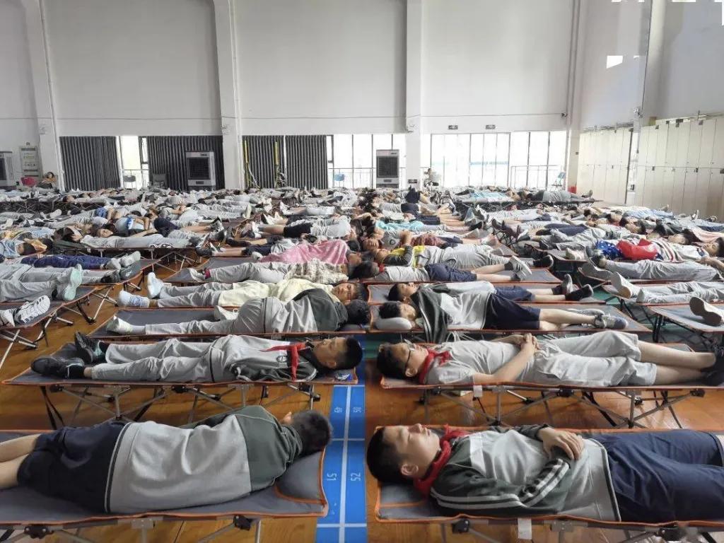 浙江省舟山一中则将躺睡统一安排在体育馆内,馆内按A到G点位进行划分,实行男女分开原则。同时,场馆内配备收纳储物柜、睡椅(或睡垫)、冷风机和空调。学生可按规定位置实名使用睡椅或睡垫,自行叠放睡椅或睡垫。