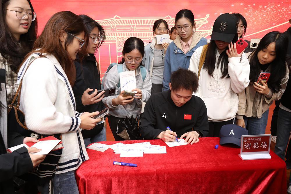 分享尾声,现场同学们排队与谢思埸合影并签名留念,表示将以奥运冠军谢思埸为榜样,把拼搏精神转化为自己的行动,把爱国精神铭记于心,在人生的赛道上以坚定信仰与实干担当,争做新时代有为青年,在民族复兴的征程上奋勇冲锋。