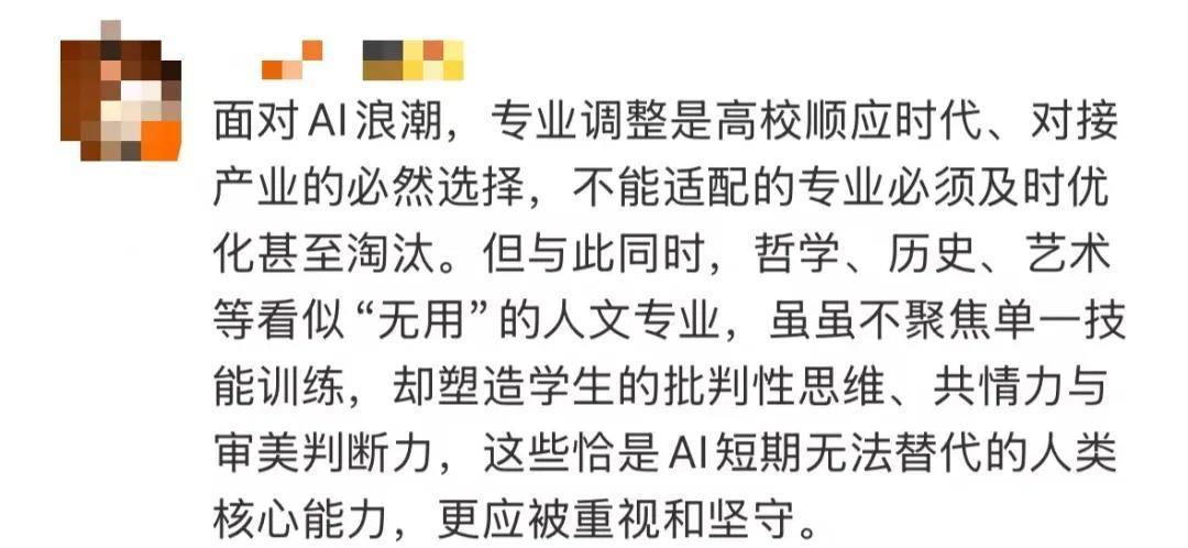 也有网友认为,面对AI浪潮,专业调整是高校顺应时代的必然选择,但一些AI无法替代的人类核心能力,更应被重视和坚守——
