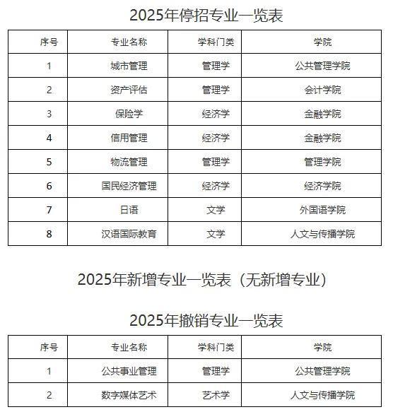 浙江财经大学2025年停招8个本科专业:城市管理、资产评估、保险学、信用管理、物流管理、国民经济管理、日语、汉语国际教育;撤销2个本科专业:公共事业管理、数字媒体艺术。