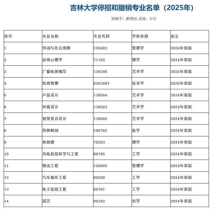 此前,吉林大学发布停招和撤销专业名单(2025年),19个专业已停招。