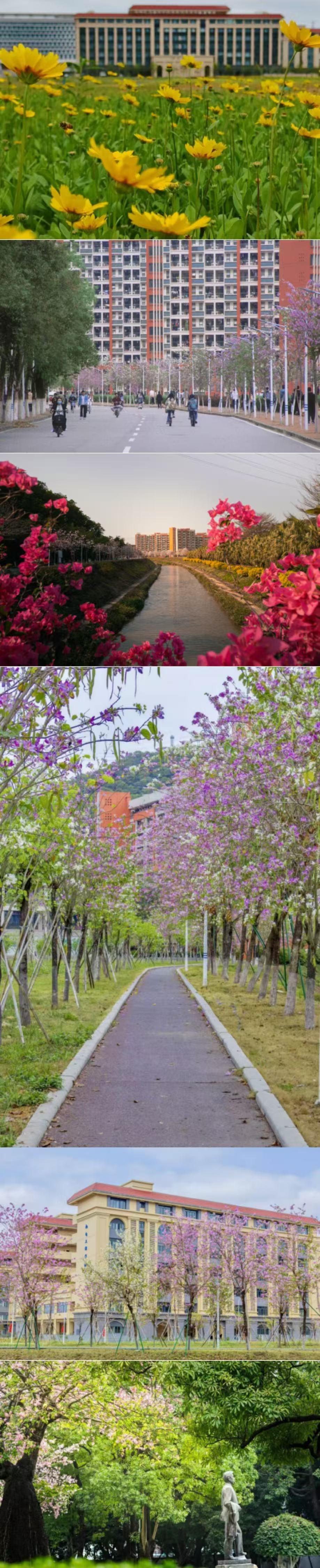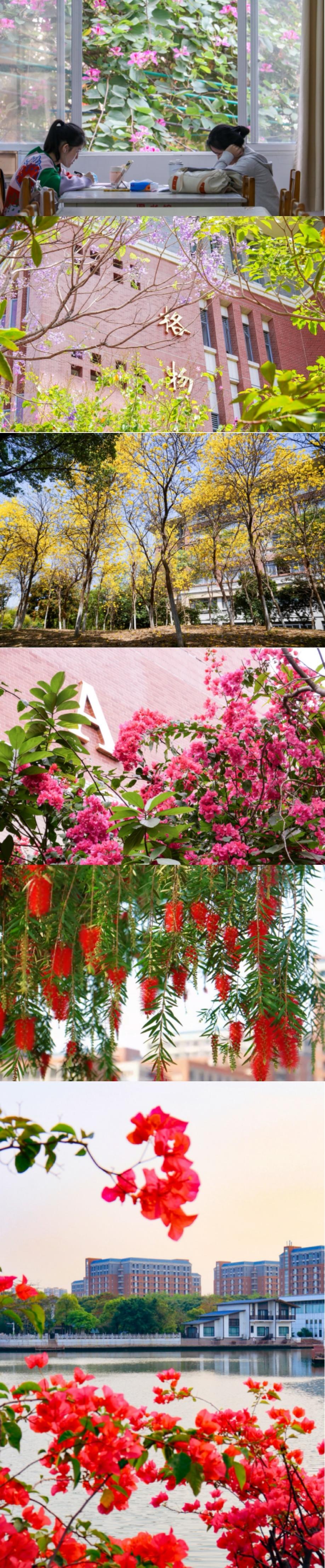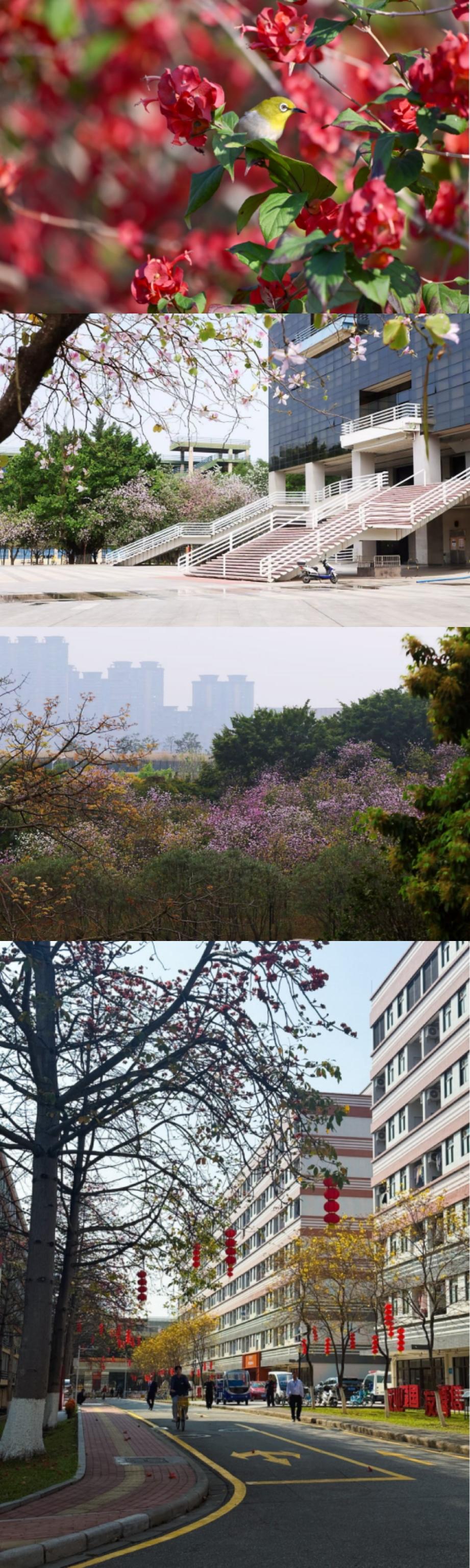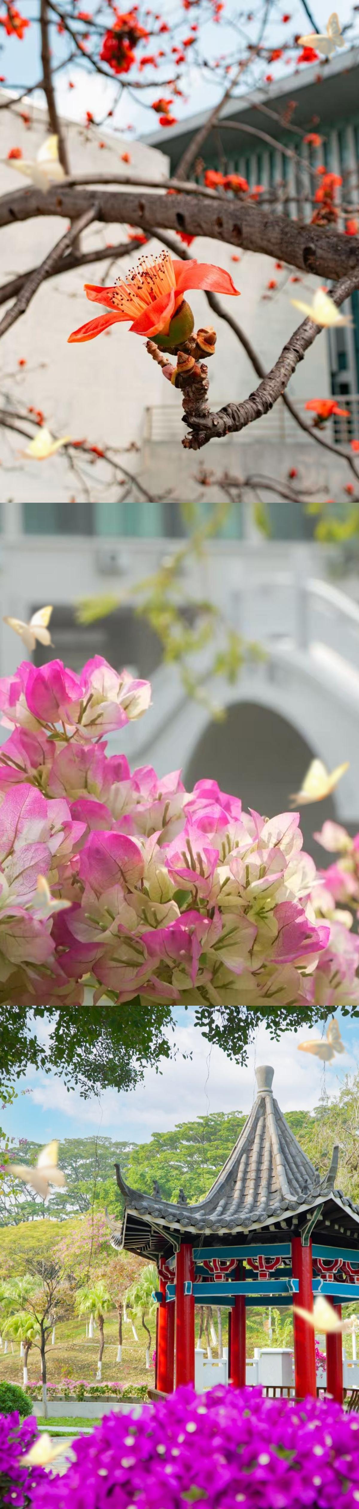 相思河畔,三角梅热烈绽放,如霞似锦;校道两旁,紫荆花次第盛开,落英翩跹;木棉挺立枝头,红焰灼灼,尽显岭南风骨。