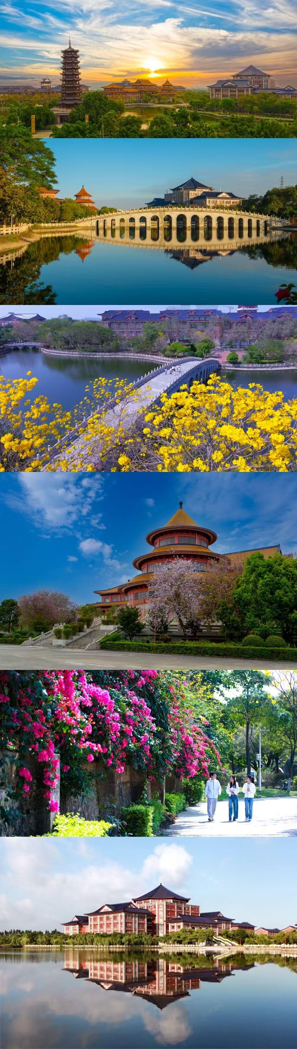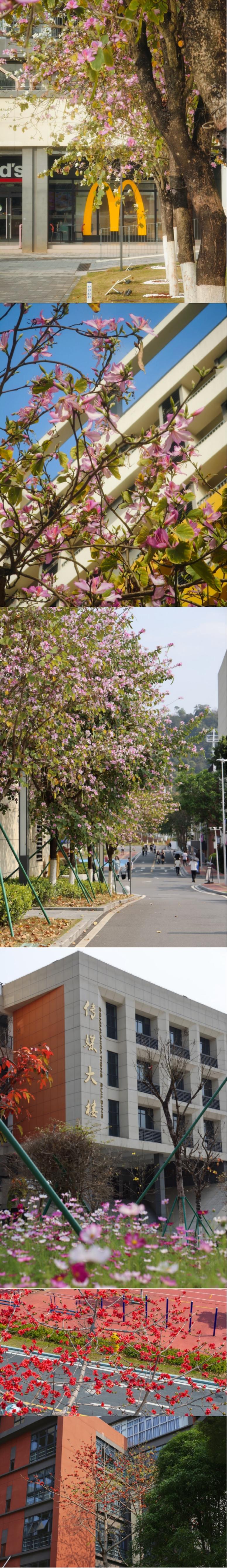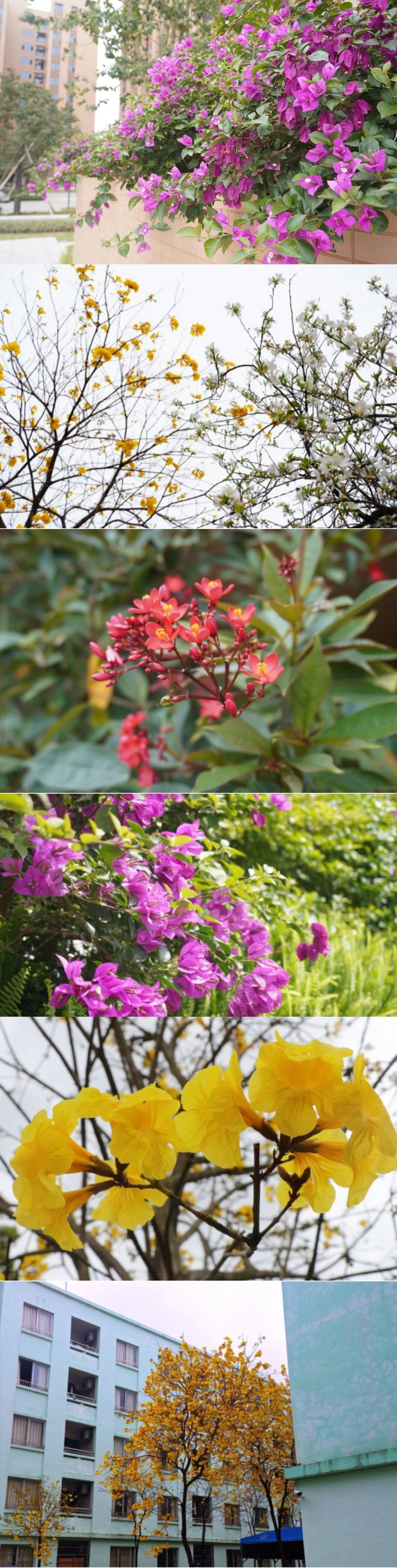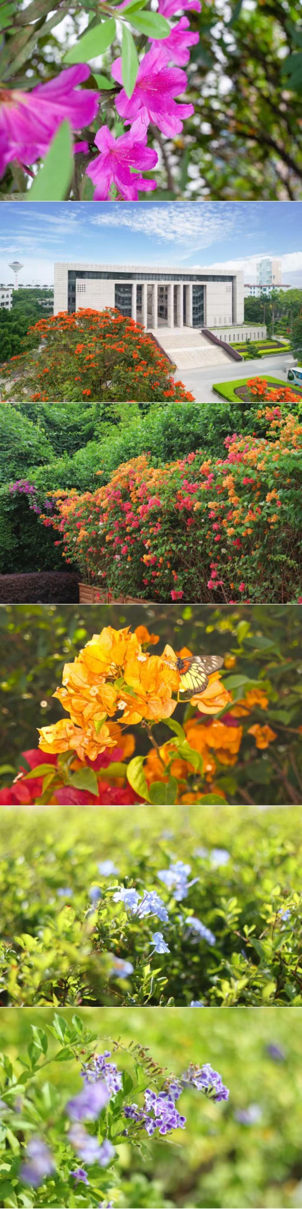 相思河畔,三角梅热烈绽放,如霞似锦;校道两旁,紫荆花次第盛开,落英翩跹;木棉挺立枝头,红焰灼灼,尽显岭南风骨。