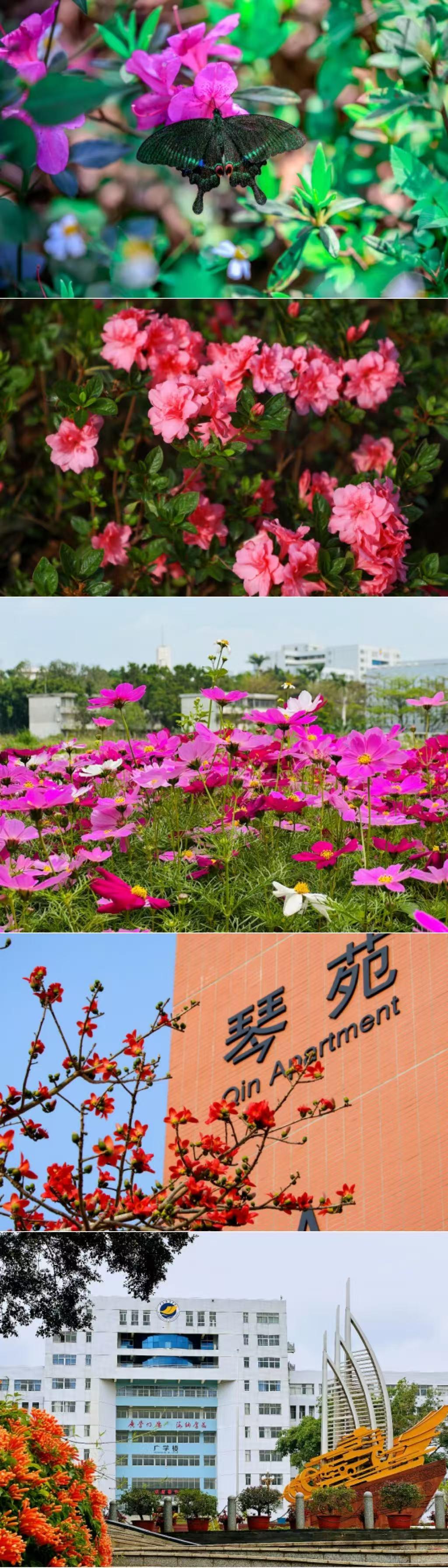 湖光校区蝴蝶湖畔的木棉花热烈盛放,海洋广场的炮仗花缀满廊架,校道两侧的格桑花随风摇曳;阳江校区里,杜鹃花层层绽放,粉艳动人,成为校园里一道亮眼的风景。