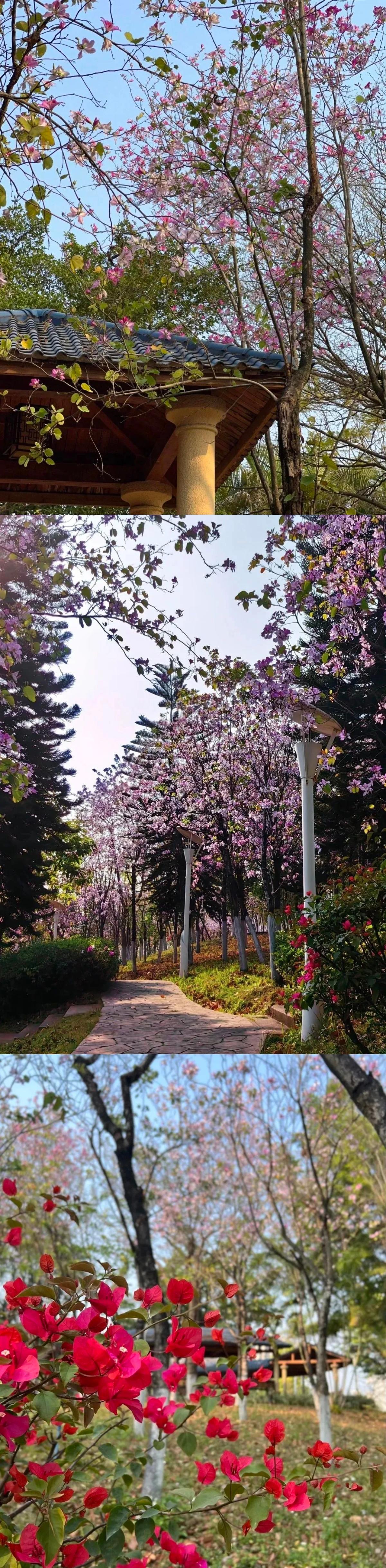 据不完全统计,华农校内共种有紫荆 5000 多株,以宫粉羊蹄甲为主;樱花 2000 多株,黄花风铃木 500 多株,还建有木兰园、紫薇杜鹃园、山茶园等。目前,华农 “校花” 已到最佳观赏期,市民可在学校公众号上预约进校参观。