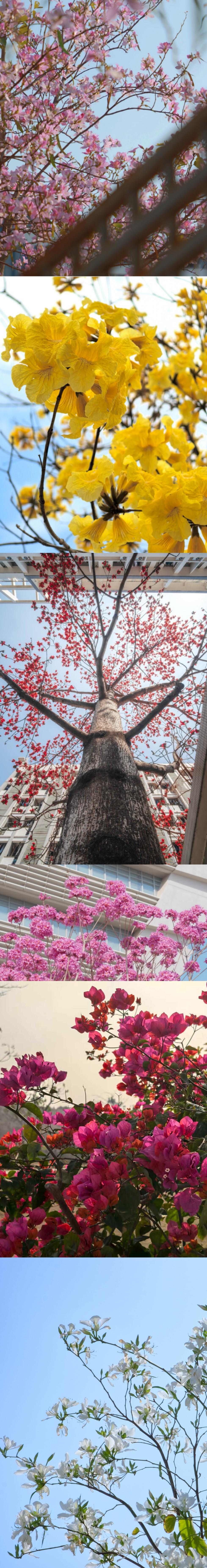 近日,华南农业大学的宫粉羊蹄甲、黄花风铃木、樱花、木棉、玉兰已竞相开放,尤其是行政楼前的宫粉羊蹄甲已全面盛放,连绵成海,美不胜收,引得不少市民前往参观。