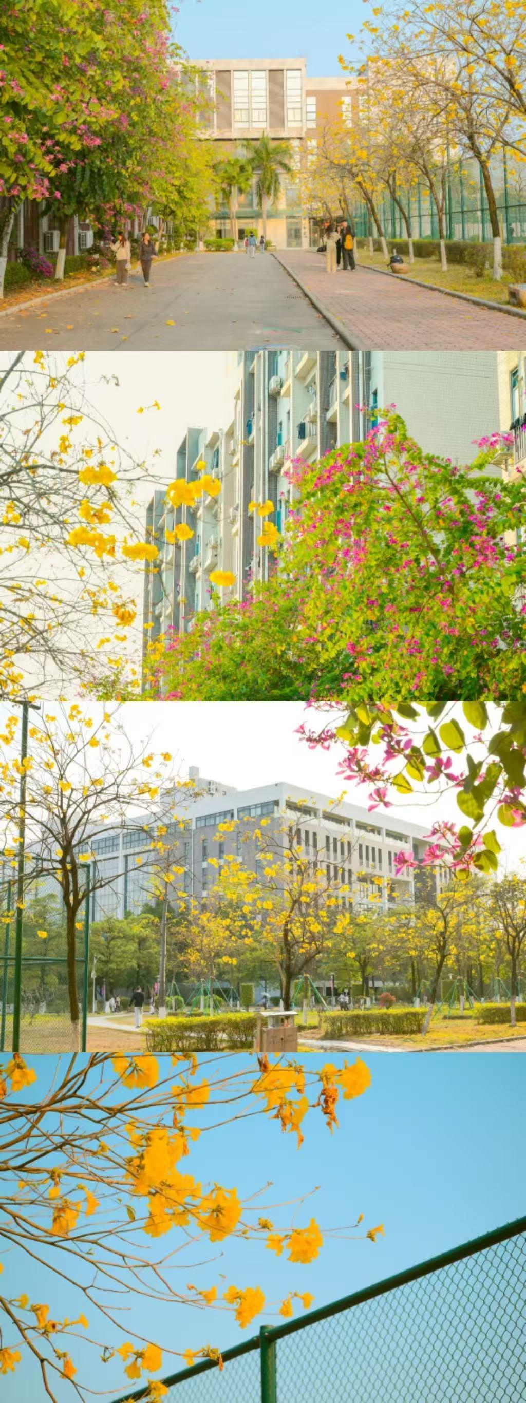 漫步校园,春色盈眸 —— 盛放的木棉,火红热烈,傲然挺立于枝头;微风拂过,校道旁的紫花风铃木,漾起串串铃音,摇曳生姿;与之相映的黄花风铃,也金灿灿地缀满枝头。