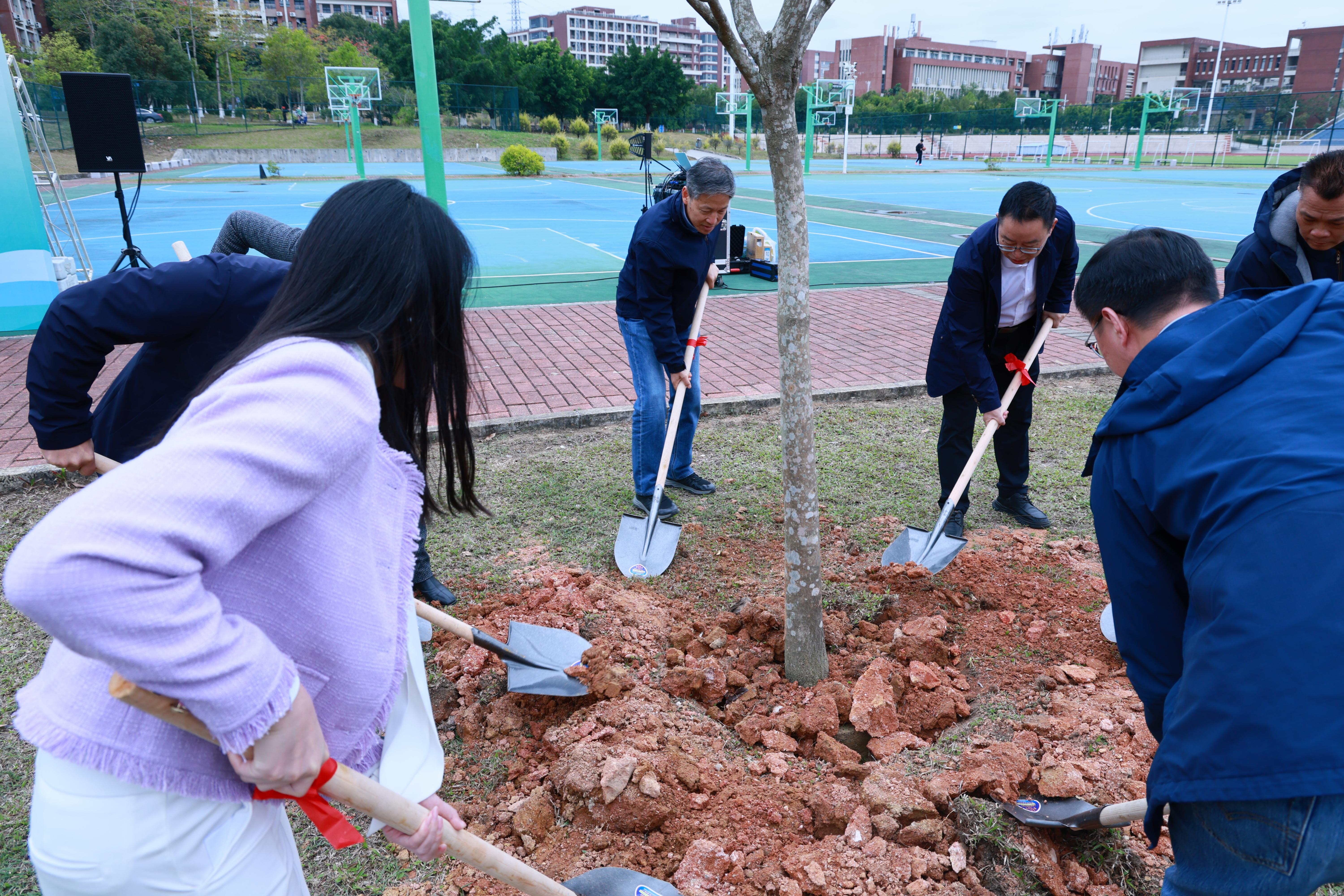 活动现场气氛热烈,欢声笑语交织,一株株新栽的树苗迎风挺立、错落有致,为初春的校园增添了无限生机,生动绘就了一幅“校友情深植沃土,绿树成荫映初心”的动人图景。