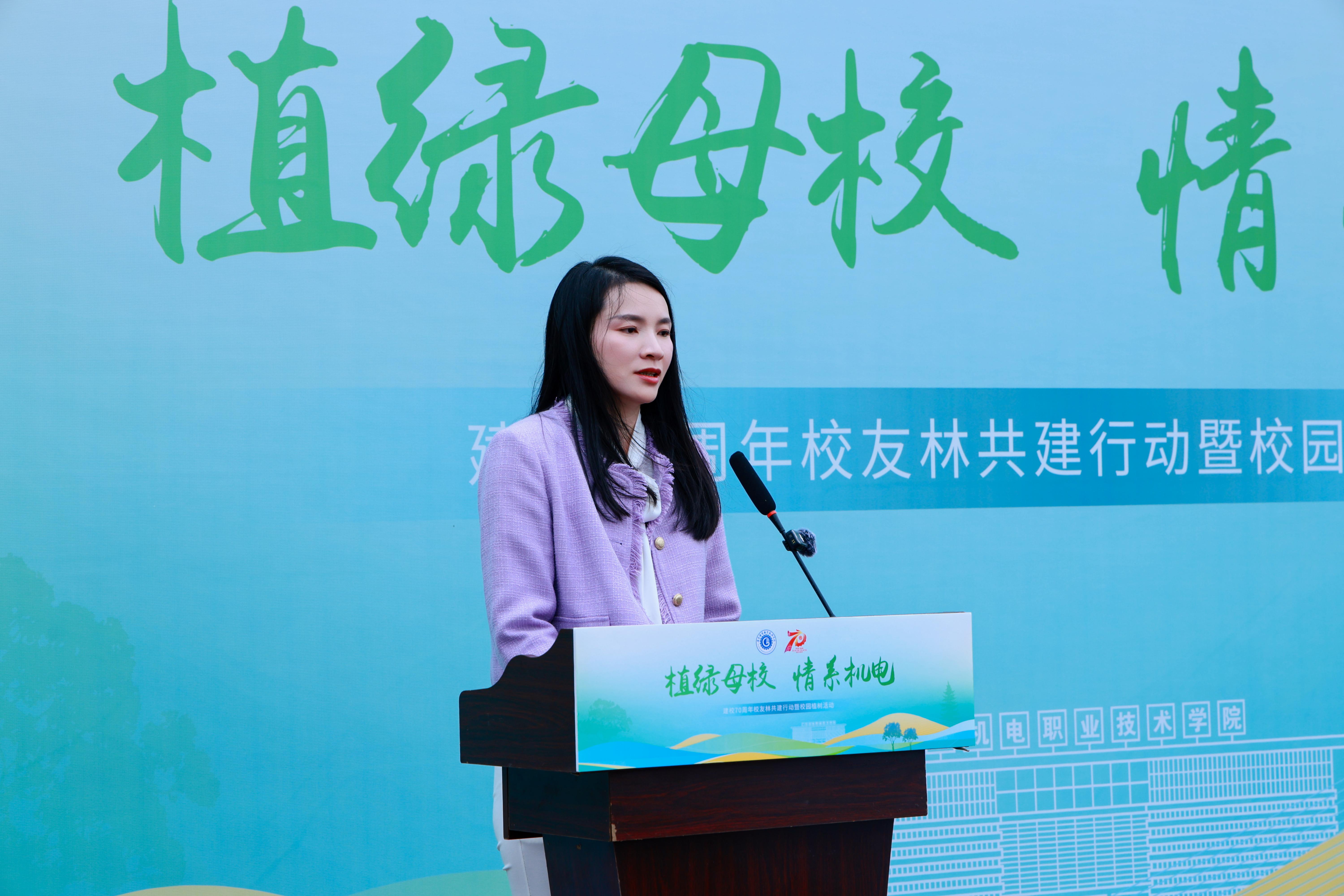 现场,校友代表陈文舒深情回顾了在校青春岁月。她讲述了自己16年前创业梦想在母校沃土生根发芽,如今欢创集团已发展成为百亿级规模的奋斗历程。“十年树木,百年树人。”她动情地表示,今天栽种的不仅是树苗,更是机电人的初心与血脉相连的情感纽带。作为校友代表,她将带领各区域校友会整合优势资源,搭建校企合作平台,推动产学研深度融合,让“机电精神”在更广阔的舞台上绽放璀璨光彩。