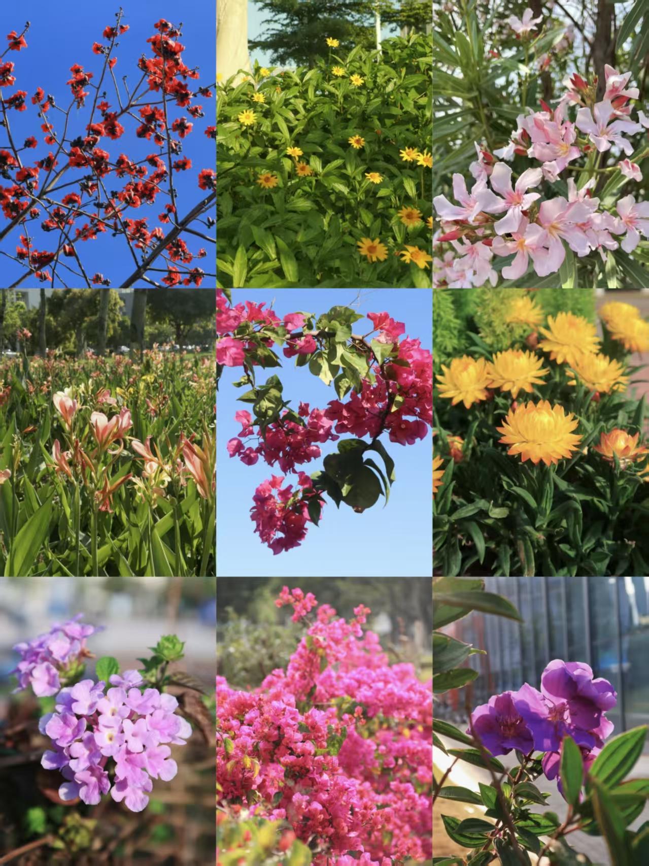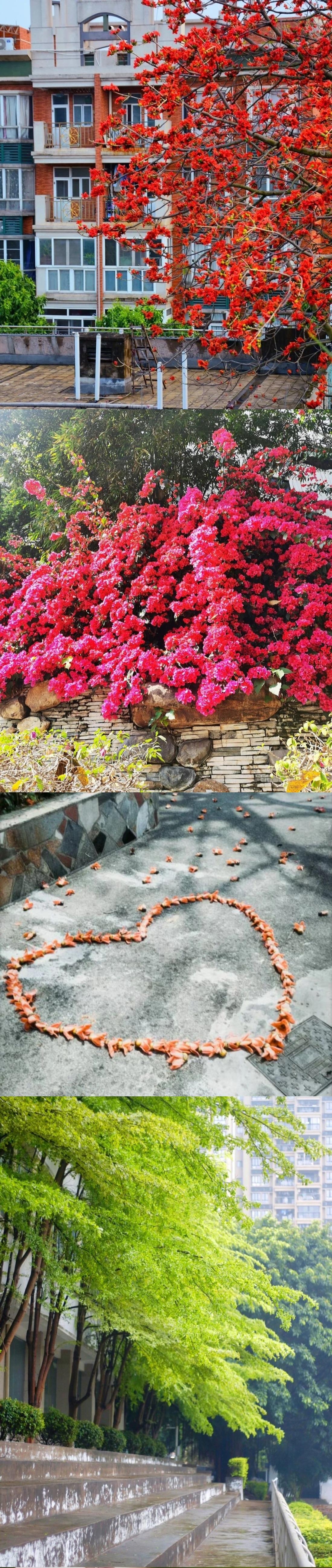 葱兰在晨光中舒展洁白的瓣,像撒在绿毯上的星子;宫粉羊蹄甲缀满枝头,紫霞与蓝天相映成画;三角梅攀着廊檐热烈盛放,红得像少年人滚烫的理想;山茶花在叶间藏起娇颜,红蕊凝露,是春日里最含蓄的惊艳;黄蝉花举着喇叭似的花冠,把阳光的暖意唱给路过的风;木棉树擎起满枝炽红,像英雄的火炬,点燃整个校园的朝气;还有酢浆草铺成粉紫的星野,与蕨类的绿意缠缠绵绵;白洋紫荆则在高处摇落满树雪色,让风里都飘着清甜的香……