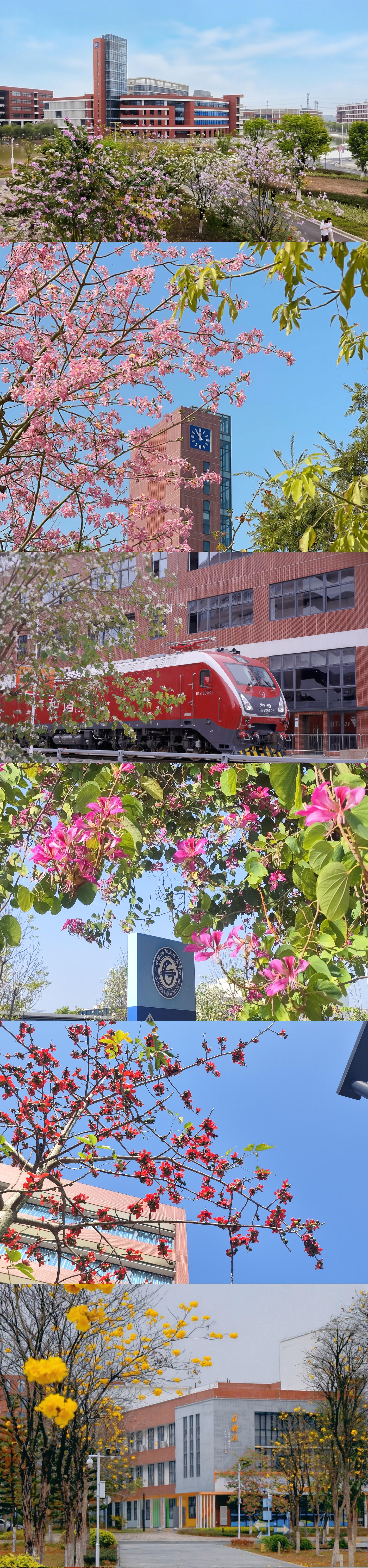 整幅画卷由远及近,蓝天为底,钟楼矗立,粉色紫荆花簇簇缀满枝头,与湛蓝天空相映成趣;和谐号静静穿行其间,缓缓驶入这片花海,车身与繁花相互映衬,温柔地勾勒出校园里铁道与青春相融的模样;木棉花傲然挺立枝头,艳红似火,尽显铁路学子坚毅向上的风骨。校道旁的黄花风铃木缀满枝头,金黄灿烂,在春风中轻轻摇曳,为这幅春日画卷添上了一抹明媚的亮色。