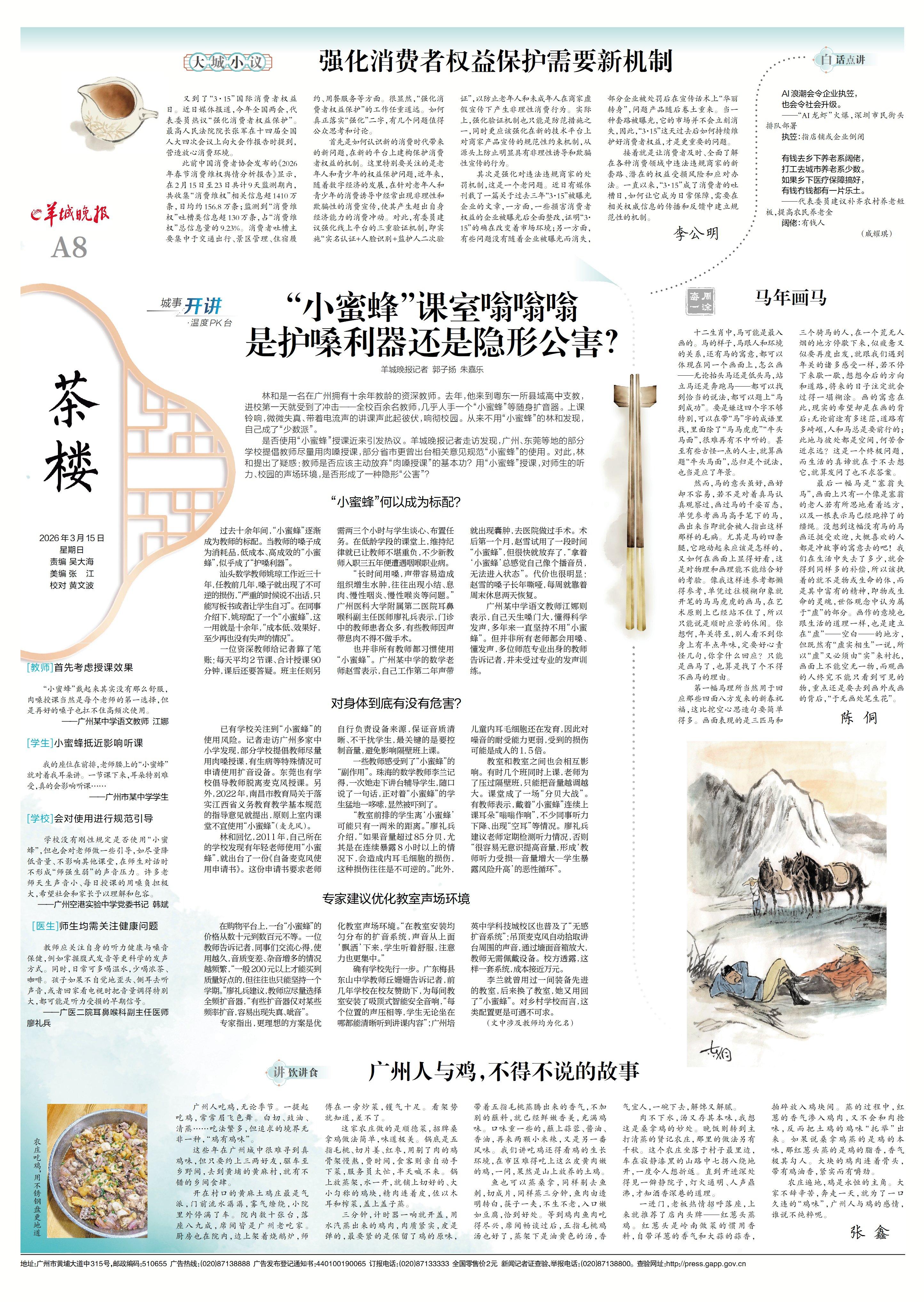 记者走访发现,广州、东莞等地已有学校提倡教师尽量用肉嗓授课,部分省市更曾出台相关意见规范“小蜜蜂”的使用。在教育圈,是否使用“小蜜蜂”授课这一话题也反复引发热议——教师是否应该主动放弃“肉嗓授课”的基本功?用“小蜜蜂”授课,是否会成为伤害师生听力、扰乱校园声场的隐形“公害”?
