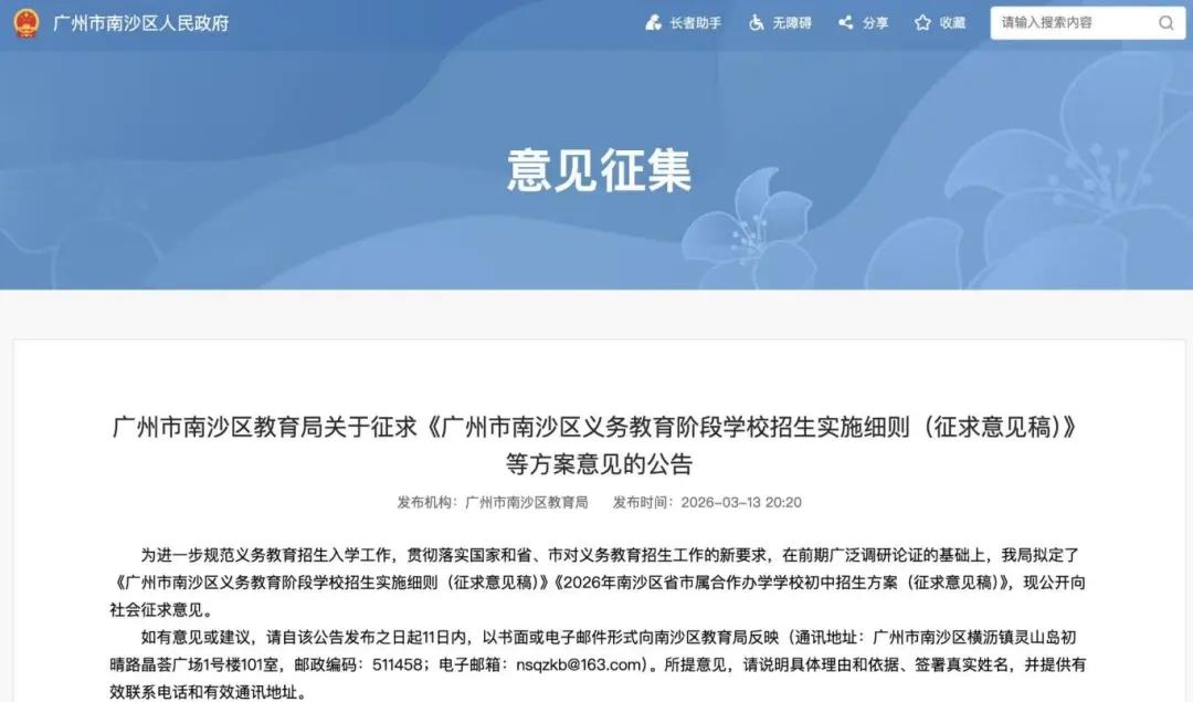 3月13日,广州市南沙区人民政府门户网站发布“广州市南沙区教育局关于征求《广州市南沙区义务教育阶段学校招生实施细则(征求意见稿)》等方案意见的公告”。