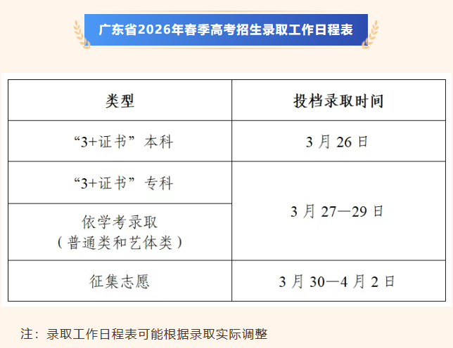 3月17日,广东省教育考试院发布了广东省2026年春季高考招生录取工作日程表。其中,“3+证书”本科将于3月26日投档录取;“3+证书”专科、依学考录取(普通类、艺体类)将于3月27日-29日录取;征集志愿将在3月30日-4月2日进行。
