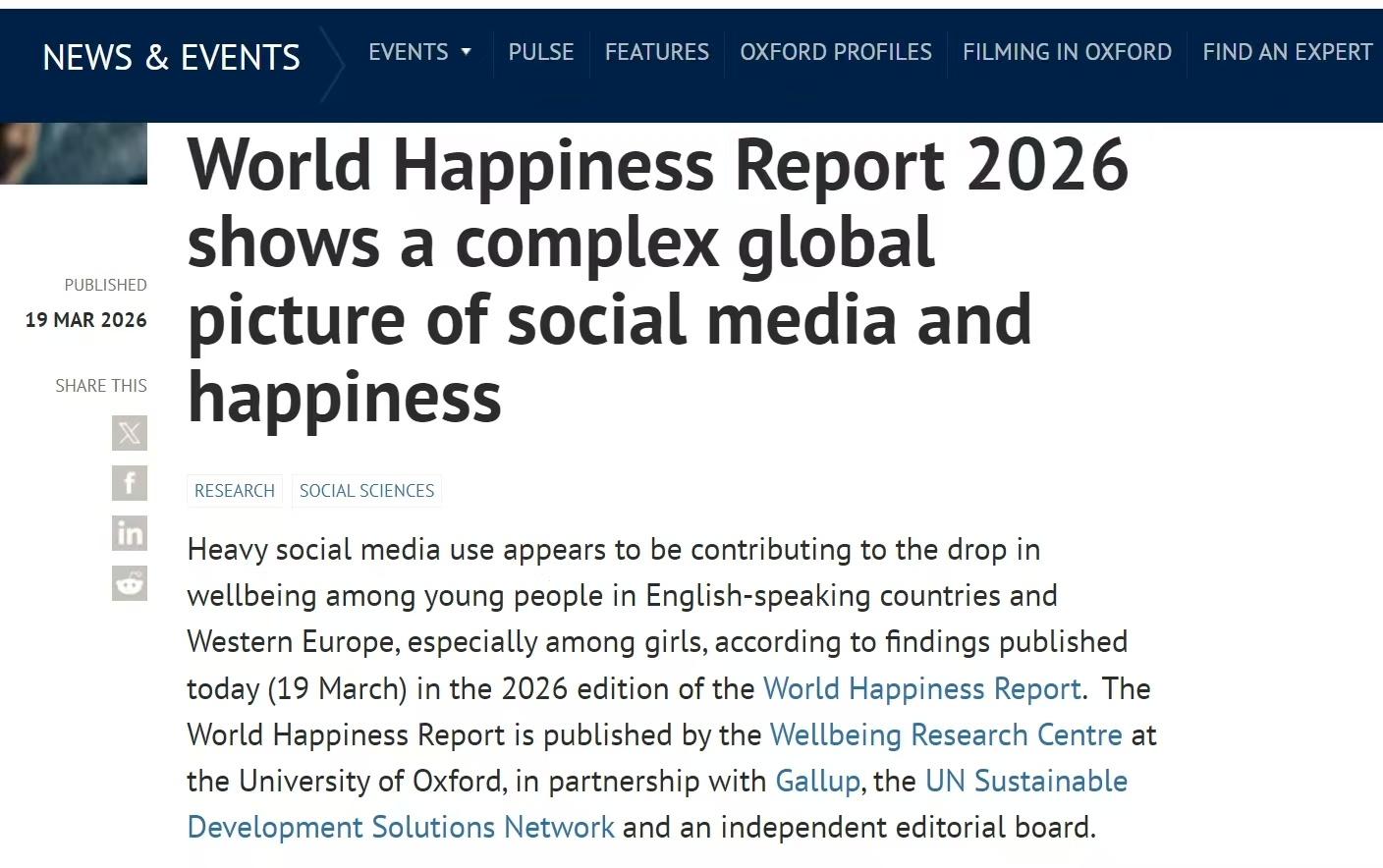 该《报告》作者之一、牛津大学经济学教授、牛津大学幸福研究中心主任伊曼纽尔·德内夫说:“我们必须传递一个清晰且坚定的信号——让社交媒体回归‘社交’的本质。”