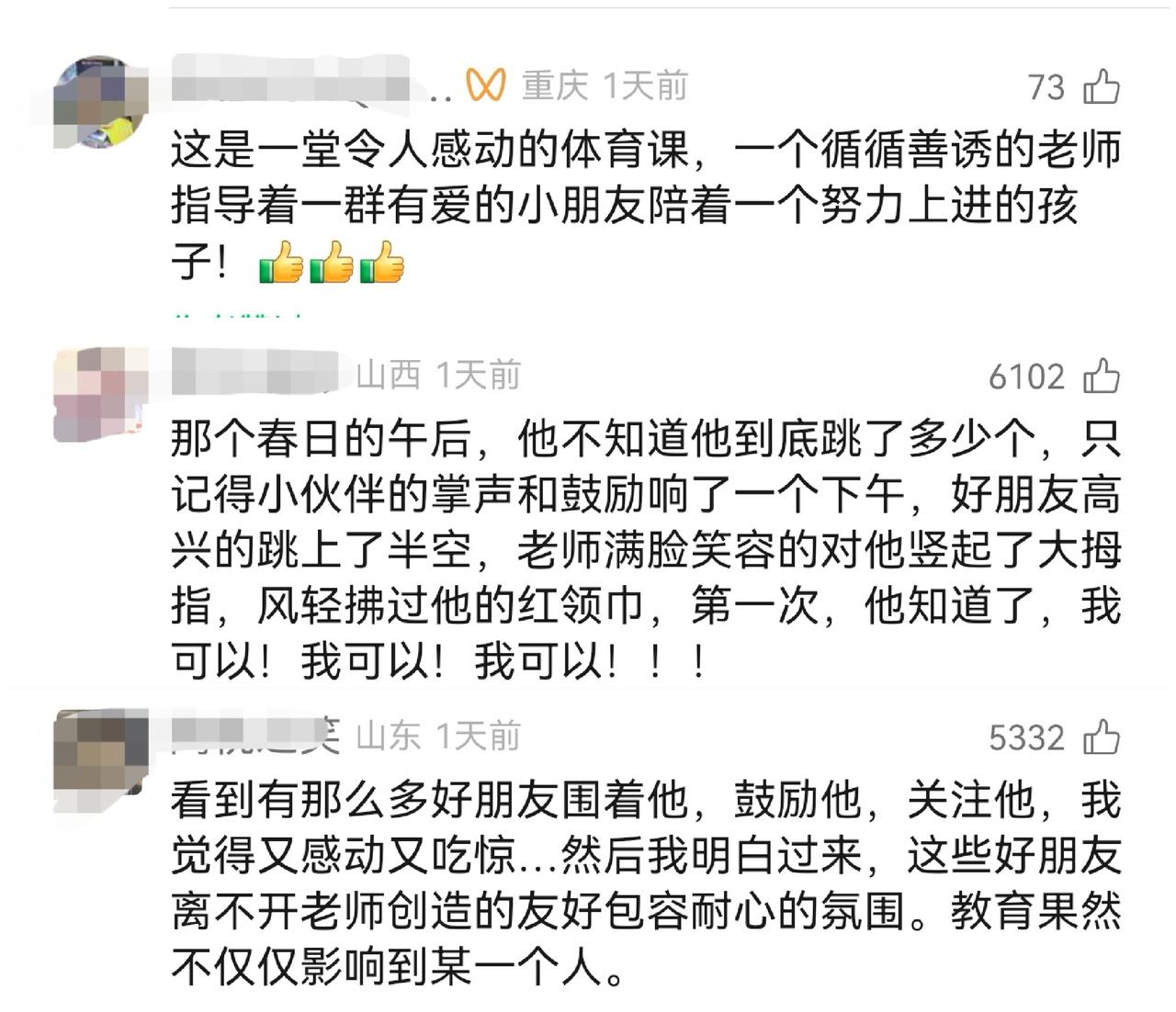 网友们的评论也满是感动与认可。有人说,“这才是教育最本真的模样:不抛弃、不放弃,耐心陪伴,温柔鼓励”;有人感慨,“那个春日的午后,他记住的不只是跳绳的数量,还有小伙伴的掌声和老师的肯定”;也有人直言,“没有不会的孩子,只有愿意用心陪伴的好老师”。