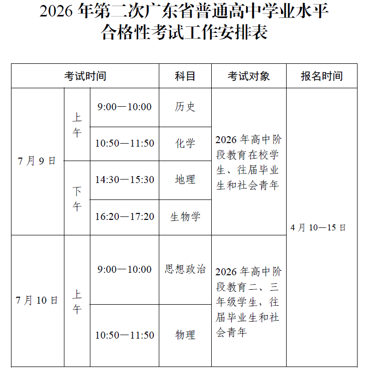3月23日,据广东省教育考试院发布,2026年第二次广东省普通高中学业水平合格性考试将于2026年7月9日至10日进行,报名时间为2026年4月10日至15日。