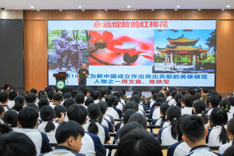 李胜利以《永远绽放的红棉花》为题,结合丰富的史料,还原历史细节,讲述了周文雍、陈铁军等广州革命烈士无畏牺牲、忠贞不屈的英勇事迹,再现“刑场上的婚礼”等壮烈场景,传递“烈士精神永不凋零”的坚定信念,激励青年学生缅怀革命先烈、传承红色基因。