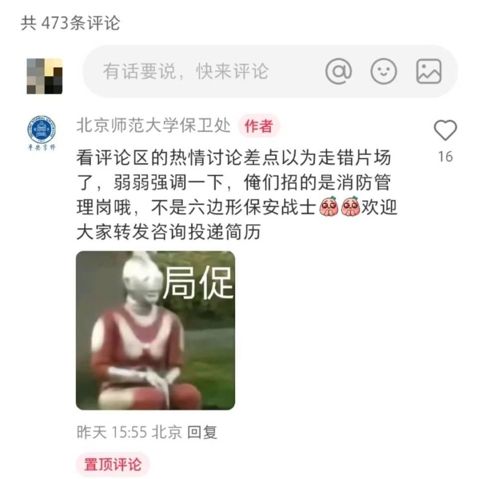 3月20日,北师大官网发布招聘启事,面向应届毕业生招聘事业编制管理岗位人员,一共招2人,其中之一为该岗位。招聘有笔试、面试、政审等环节。3月25日,该校保卫处账号在社交平台发布该岗位招聘广告,引发网友热议。