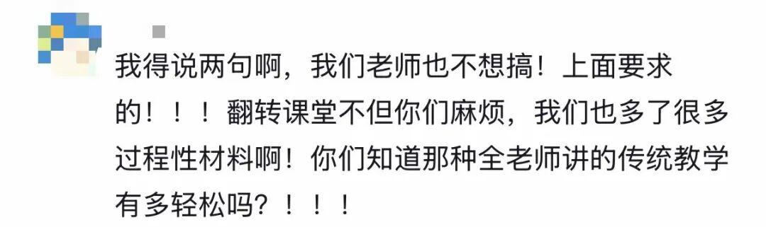 而不满的不只是学生,在评论区中,也有老师留言表示同样不喜欢这种模式——耗费更多精力不说,还可能耽误正常教学进度,若不是学校要求教学创新,自己并不愿意采用。